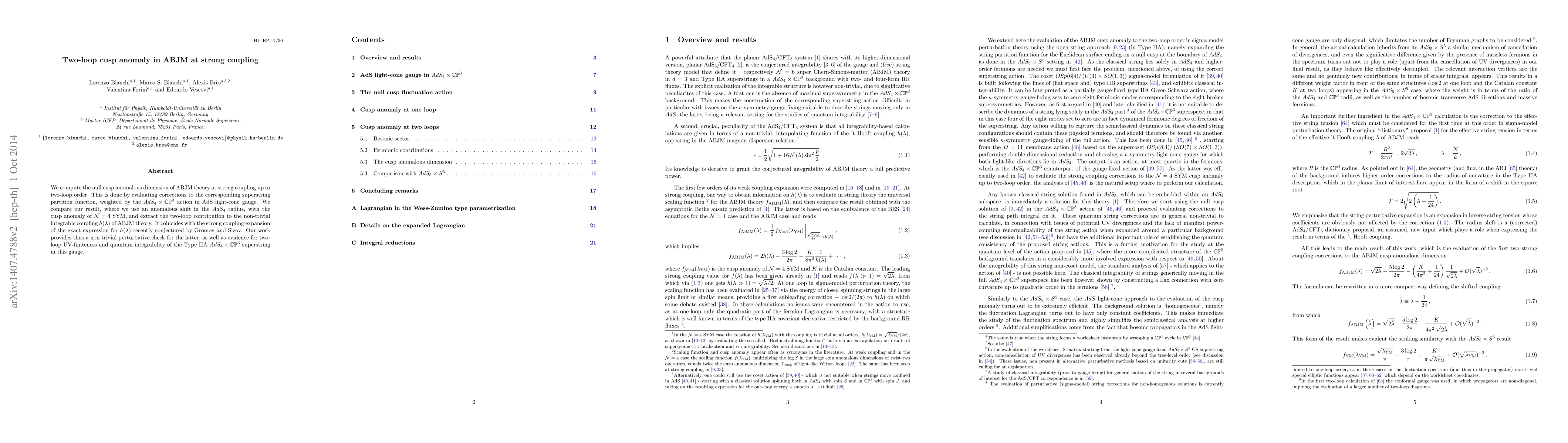 This research computes the two-loop cusp anomalous dimension in ABJM theory at strong coupling, comparing it to $\mathcal{N}=4$ SYM and validating the conjectured exact expression for the non-trivial integrable coupling $h(\lambda)$. It provides evidence for the UV-finiteness and quantum integrability of the Type IIA $AdS_4\times \mathbb{CP}^3$ superstring.