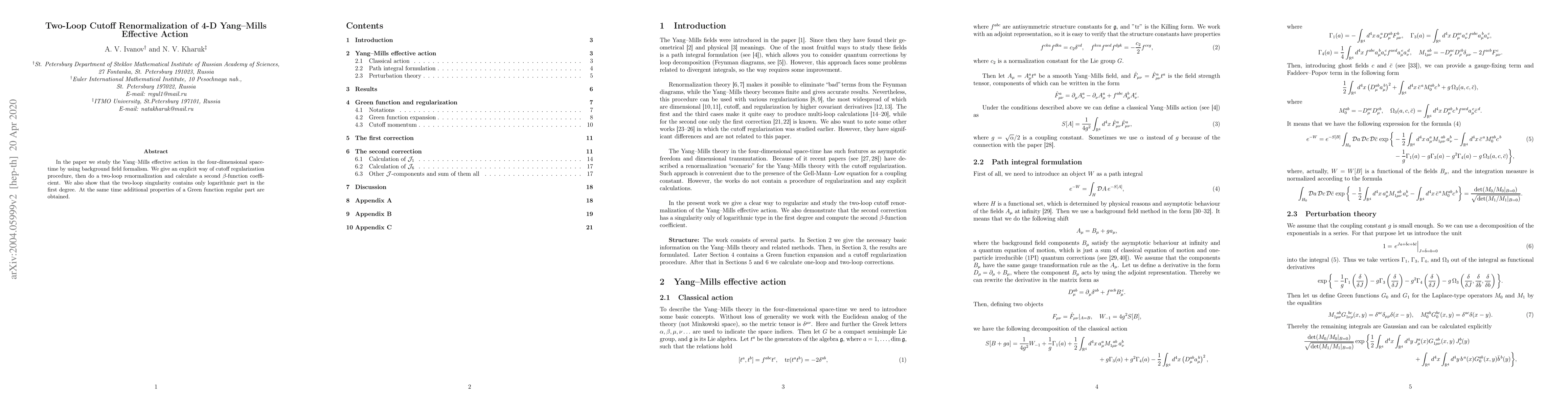 This paper employs the background field formalism to study the renormalization of the 4-D Yang-Mills effective action, detailing a two-loop cutoff regularization procedure and calculating the second coefficient of the $\beta$-function. It reveals that the two-loop singularity is logarithmic to the first degree and provides additional properties of the Green function's regular part.