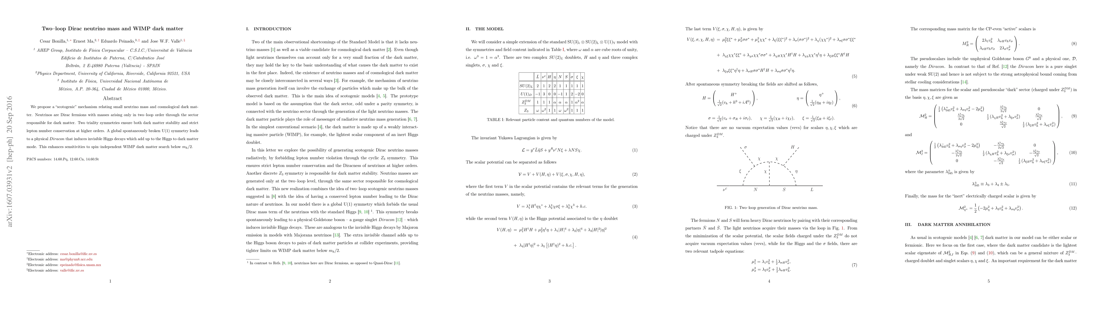 This paper proposes a "scotogenic" mechanism where Dirac neutrino masses and WIMP dark matter are connected through a two-loop process. The model ensures dark matter stability and lepton number conservation via triality symmetries and a spontaneously broken U(1) symmetry, enhancing WIMP dark matter search sensitivity.