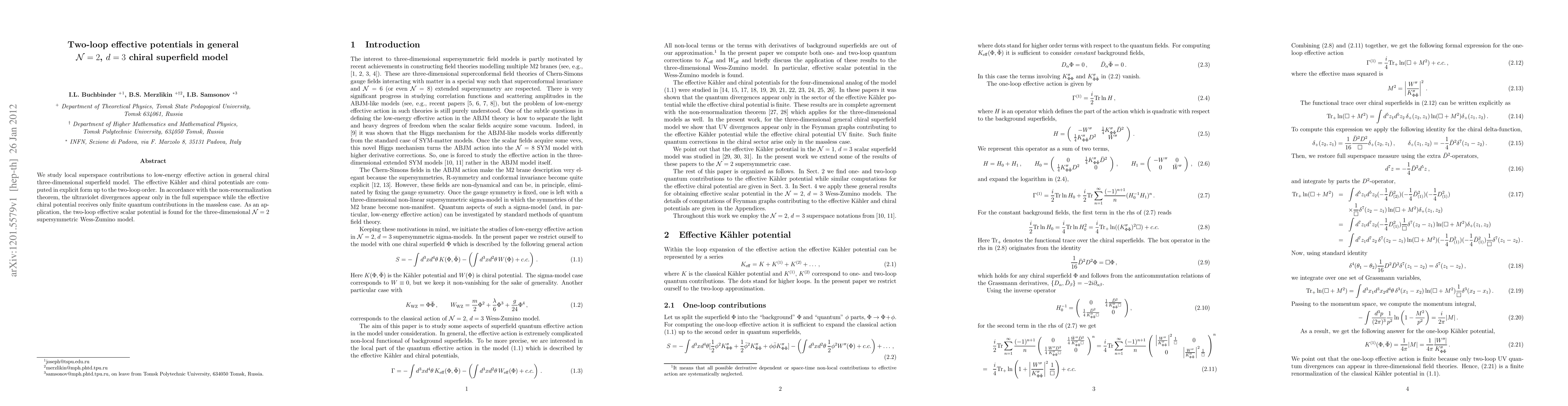 We study local superspace contributions to low-energy effective action in general chiral three-dimensional superfield model. The effective Kahler and chiral potentials are computed in explicit form up to the two-loop order. In accordance with the non-renormalization theorem, the ultraviolet divergences appear only in the full superspace while the effective chiral potential receives only finite quantum contributions in the massless case. As an application, the two-loop effective scalar potential is found for the three-dimensional N=2 supersymmetric Wess-Zumino model.
