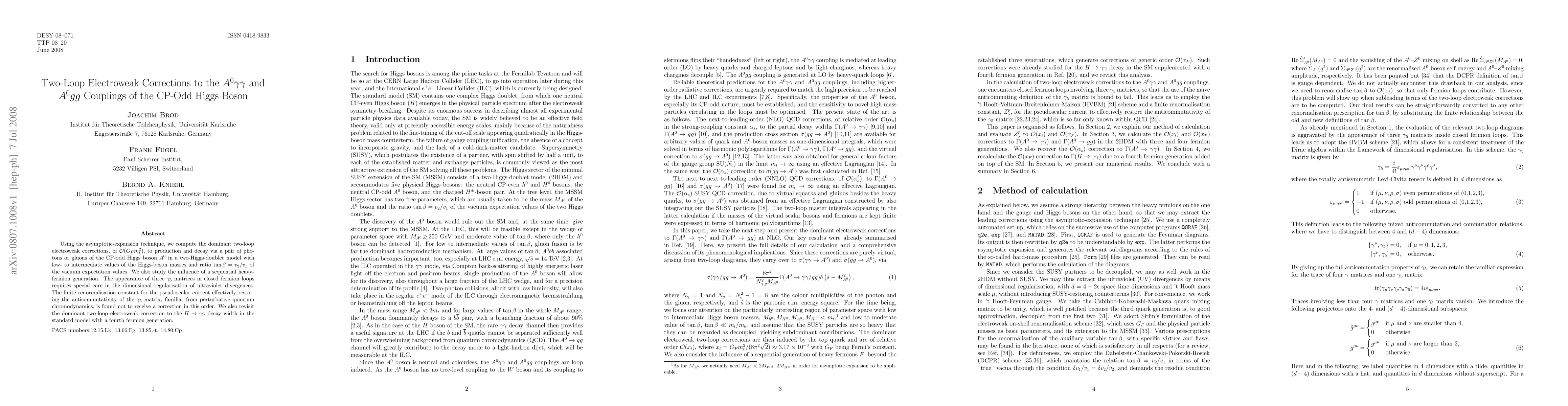 Using the asymptotic-expansion technique, we compute the dominant two-loop electroweak corrections, of O(G_F m_t^2), to production and decay via a pair of photons or gluons of the CP-odd Higgs boson A^0 in a two-Higgs-doublet model with low- to intermediate values of the Higgs-boson masses and ratio tan(beta)=v_2/v_1 of the vacuum expectation values. We also study the influence of a sequential heavy-fermion generation. The appearance of three gamma_5 matrices in closed fermion loops requires special care in the dimensional regularisation of ultraviolet divergences. The finite renormalisation constant for the pseudoscalar current effectively restoring the anticommutativity of the gamma_5 matrix, familiar from perturbative quantum chromodynamics, is found not to receive a correction in this order. We also revisit the dominant two-loop electroweak correction to the H -> gamma gamma decay width in the standard model with a fourth fermion generation.