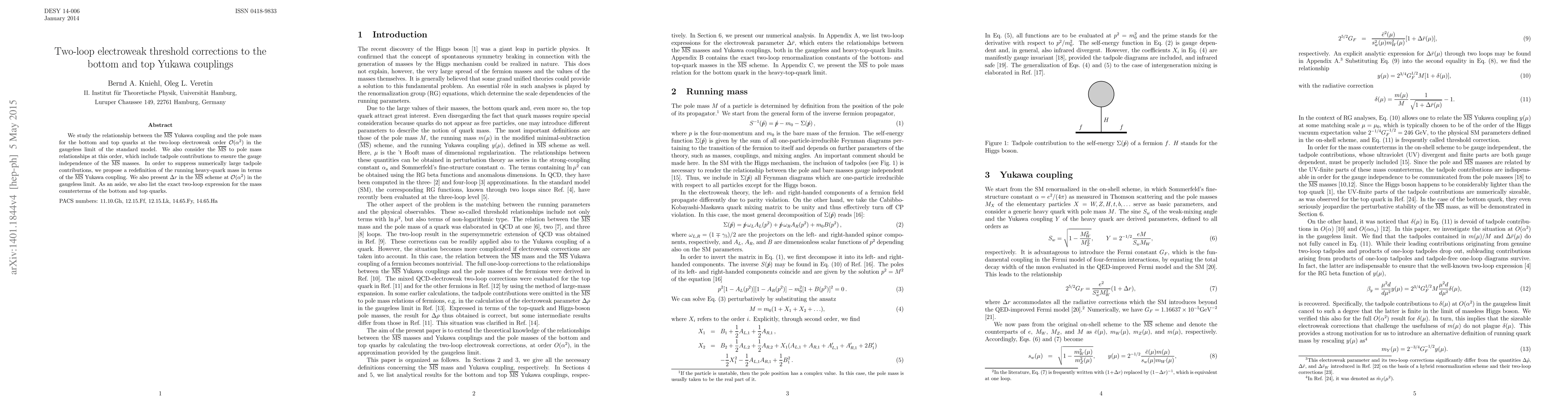 We study the relationship between the $\overline{\mathrm{MS}}$ Yukawa coupling and the pole mass for the bottom and top quarks at the two-loop electroweak order ${\cal O}(\alpha^2)$ in the gaugeless limit of the standard model. We also consider the $\overline{\mathrm{MS}}$ to pole mass relationships at this order, which include tadpole contributions to ensure the gauge independence of the $\overline{\mathrm{MS}}$ masses. In order to suppress numerically large tadpole contributions, we propose a redefinition of the running heavy-quark mass in terms of the $\overline{\mathrm{MS}}$ Yukawa coupling. We also present $\Delta r$ in the $\overline{\mathrm{MS}}$ scheme at ${\cal O}(\alpha^2)$ in the gaugeless limit. As an aside, we also list the exact two-loop expression for the mass counterterms of the bottom and top quarks.