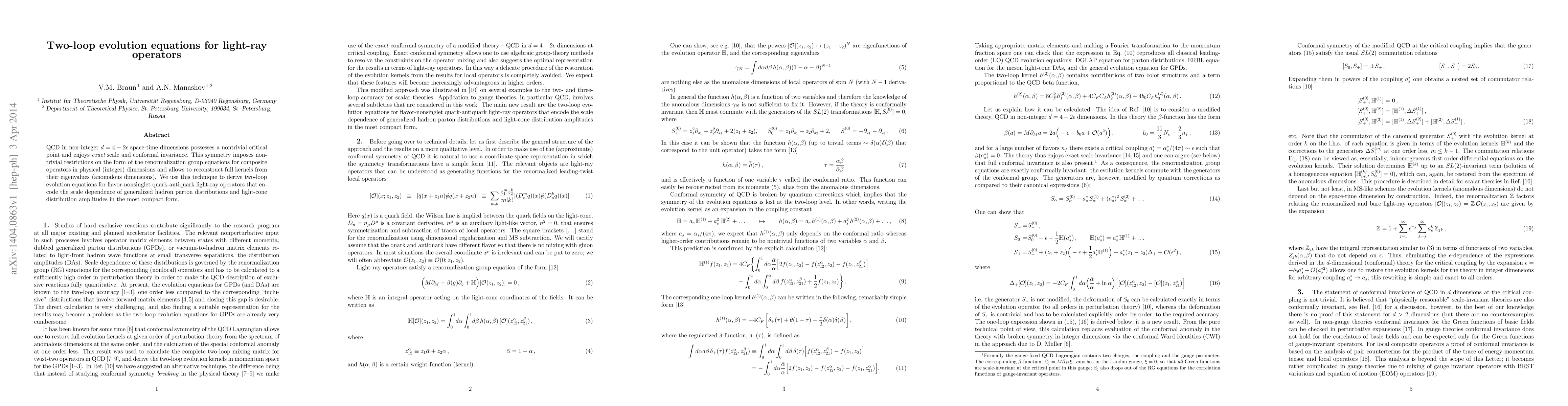 QCD in non-integer d=4-2 epsilon space-time dimensions possesses a nontrivial critical point and enjoys exact scale and conformal invariance. This symmetry imposes nontrivial restrictions on the form of the renormalization group equations for composite operators in physical (integer) dimensions and allows to reconstruct full kernels from their eigenvalues (anomalous dimensions). We use this technique to derive two-loop evolution equations for flavor-nonsinglet quark-antiquark light-ray operators that encode the scale dependence of generalized hadron parton distributions and light-cone distribution amplitudes in the most compact form.