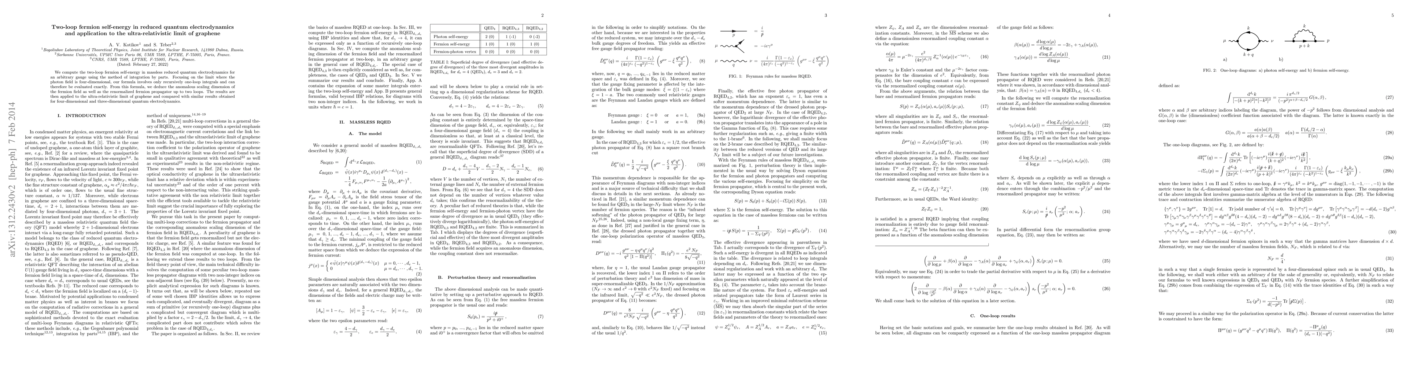 This paper computes the two-loop fermion self-energy in massless reduced quantum electrodynamics, deriving the anomalous scaling dimension and renormalized propagator. The findings are applied to the ultra-relativistic limit of graphene, comparing results with four-dimensional and three-dimensional quantum electrodynamics.