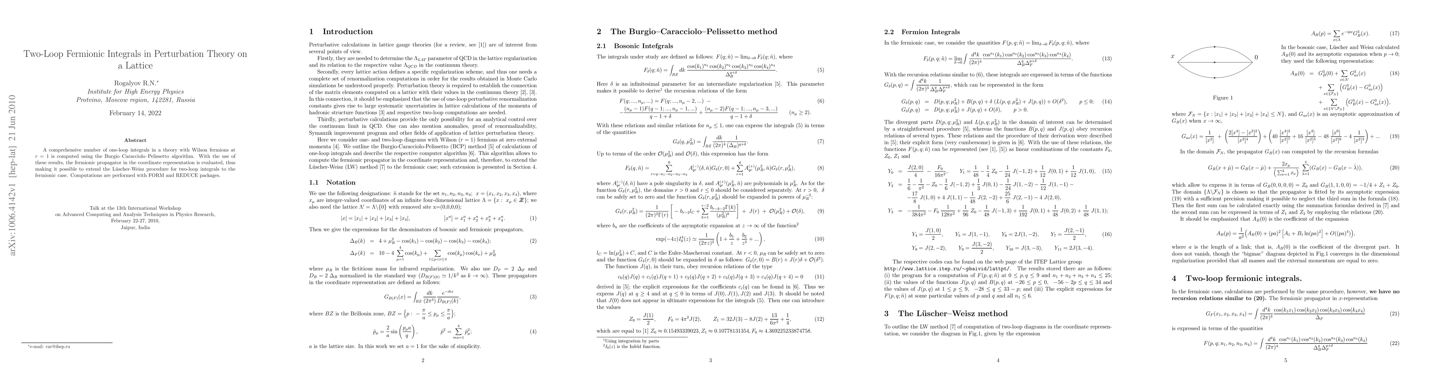 A comprehensive number of one-loop integrals in a theory with Wilson fermions at $r=1$ is computed using the Burgio-Caracciolo-Pelissetto algorithm. With the use of these results, the fermionic propagator in the coordinate representation is evaluated, thus making it possible to extend the Luscher-Weisz procedure for two-loop integrals to the fermionic case. Computations are performed with FORM and REDUCE packages.