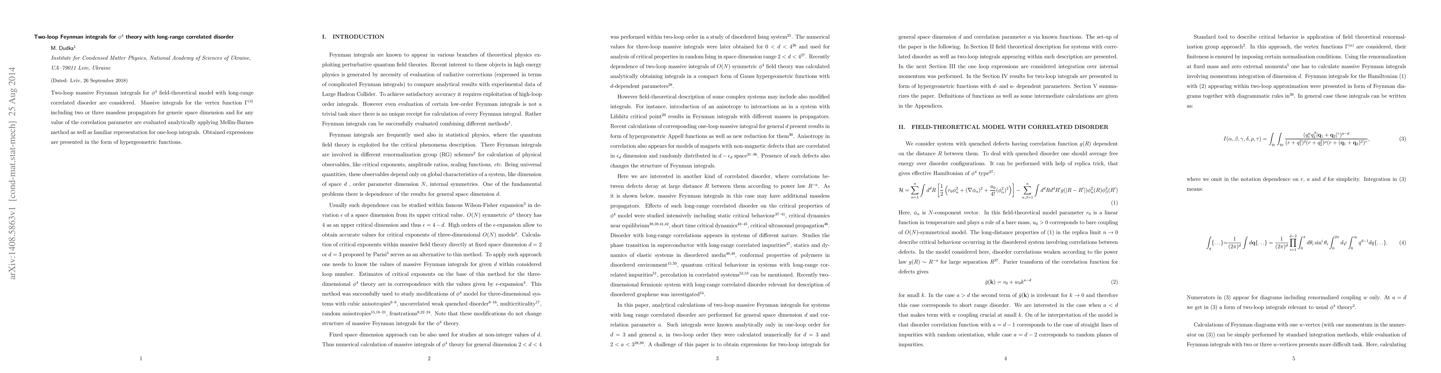 Two-loop massive Feynman integrals for $\phi^4$ field-theoretical model with long-range correlated disorder are considered. Massive integrals for the vertex function $\Gamma^{(4)}$ including two or three massless propagators for generic space dimension and for any value of the correlation parameter are evaluated analytically applying Mellin-Barnes method as well as familiar representation for one-loop integrals. Obtained expressions are presented in the form of hypergeometric functions.