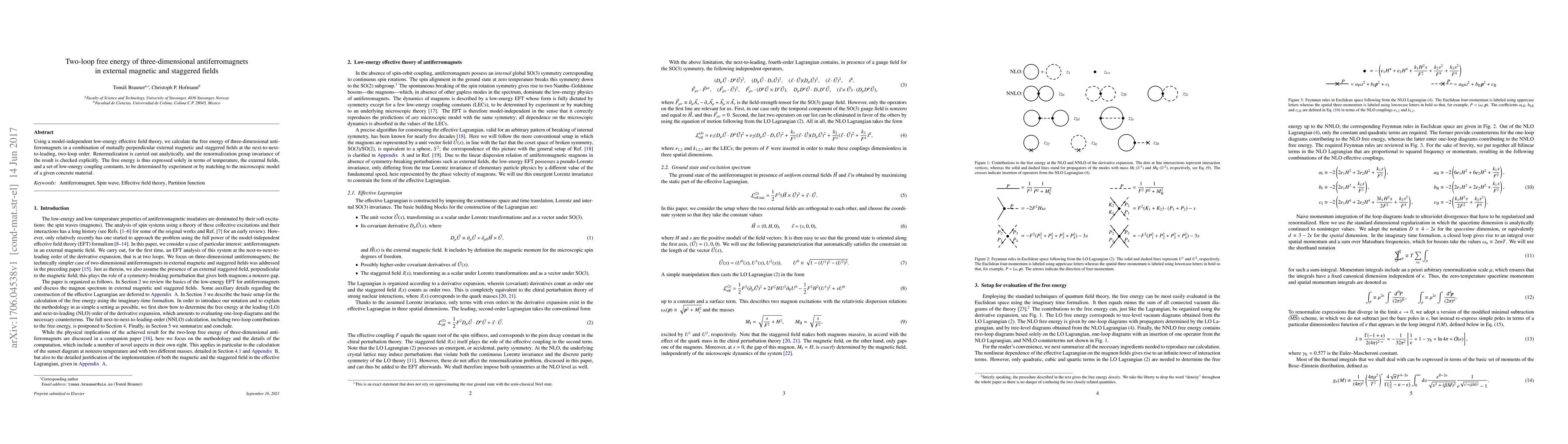Using a model-independent low-energy effective field theory, we calculate the free energy of three-dimensional antiferromagnets in a combination of mutually perpendicular external magnetic and staggered fields at the next-to-next-to-leading, two-loop order. Renormalization is carried out analytically, and the renormalization group invariance of the result is checked explicitly. The free energy is thus expressed solely in terms of temperature, the external fields, and a set of low-energy coupling constants, to be determined by experiment or by matching to the microscopic model of a given concrete material.