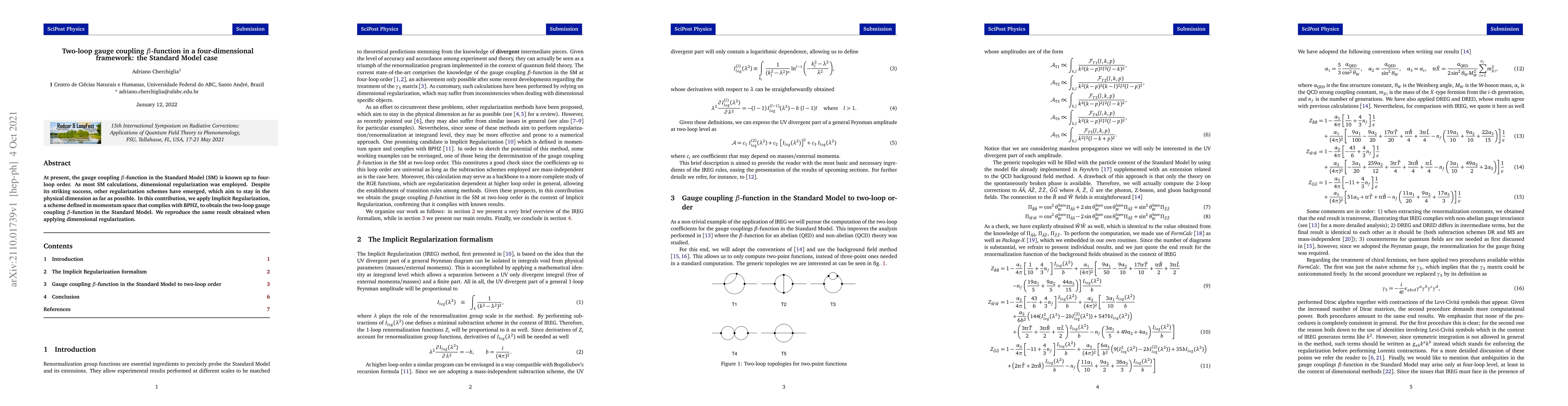 At present, the gauge coupling $\beta$-function in the Standard Model (SM) is known up to four-loop order. As most SM calculations, dimensional regularization was employed. Despite its striking success, other regularization schemes have emerged, which aim to stay in the physical dimension as far as possible. In this contribution, we apply Implicit Regularization, a scheme defined in momentum space that complies with BPHZ, to obtain the two-loop gauge coupling $\beta$-function in the Standard Model. We reproduce the same result obtained when applying dimensional regularization.