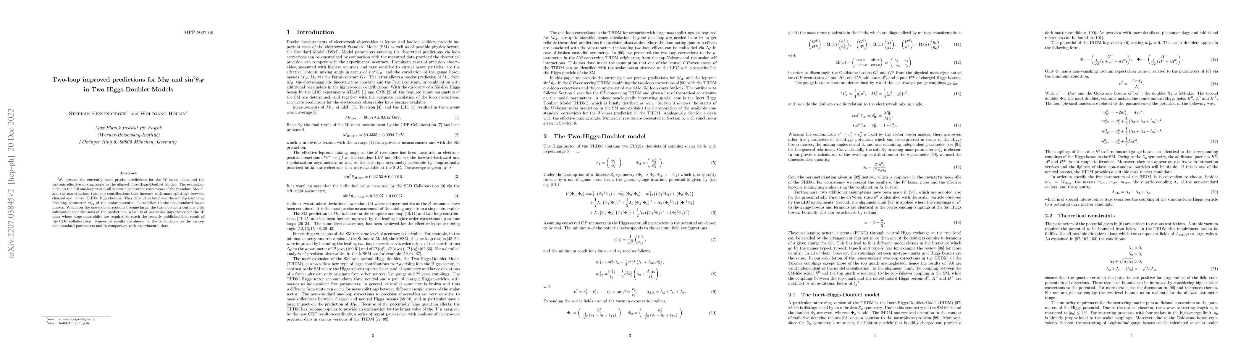 We present the currently most precise predictions for the $W$-boson mass and the leptonic effective mixing angle $\sin^2\theta_{\text{eff}}$ in the aligned Two-Higgs-Doublet Model. The evaluation includes the full one-loop result, all known higher-order corrections of the Standard Model, and the non-standard two-loop contributions that increase with mass splittings between charged and neutral THDM Higgs bosons. They depend on $\tan\beta$ and the soft $Z_2$-symmetry breakingparameter $m_{12}^2$ of the scalar potential, in addition to the non-standard boson masses. Whenever the one-loop corrections become large, the two-loop contributions yield substantial modifications of the predictions, which is of particular importance for the $W$ mass where large mass shifts are required to reach the recently published final resultof the CDF collaboration. Numerical results are shown for the dependence on the various non-standard parameters and in comparison with experimental data.