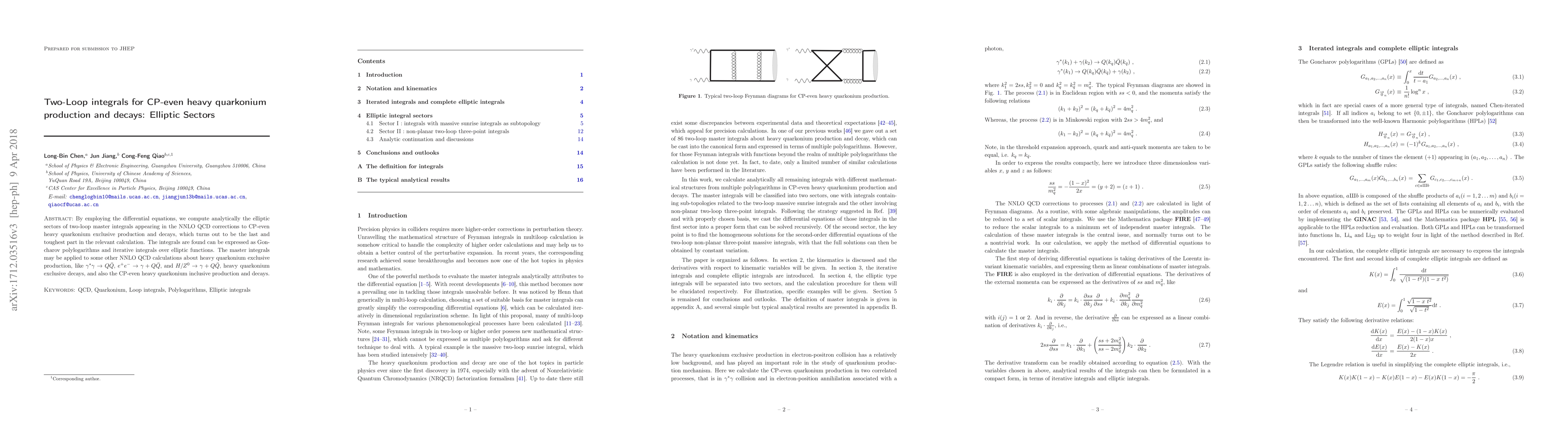 This paper analytically computes the elliptic sectors of two-loop master integrals for NNLO QCD corrections in CP-even heavy quarkonium production and decays, utilizing differential equations. The results are expressed in terms of Goncharav polylogarithms and iterative integrals over elliptic functions, which can also be applied to other NNLO QCD calculations involving heavy quarkonium.