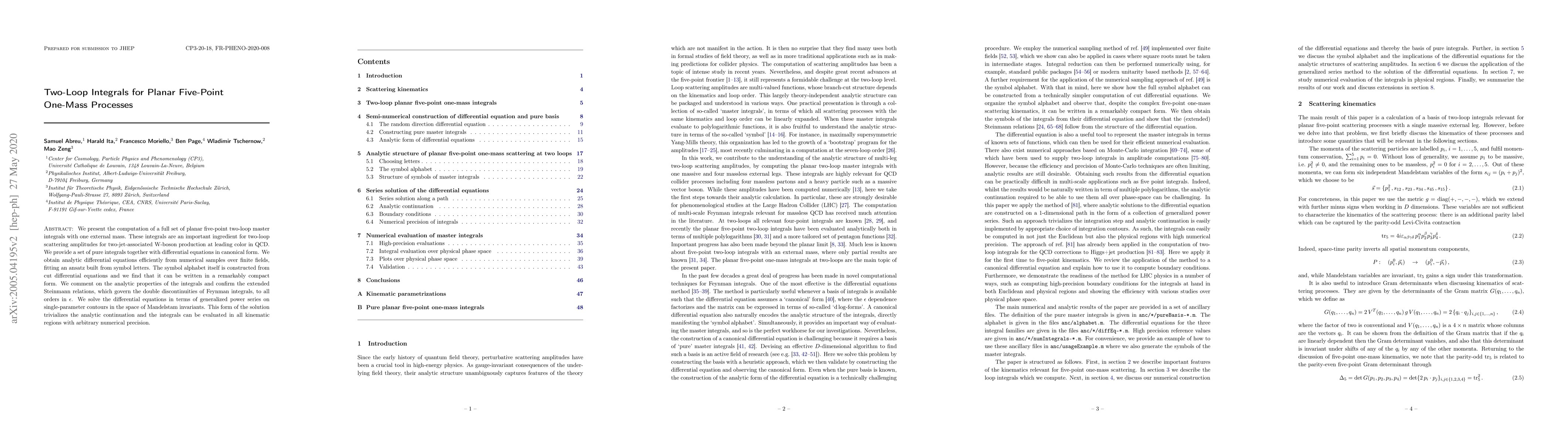 We present the computation of a full set of planar five-point two-loop master integrals with one external mass. These integrals are an important ingredient for two-loop scattering amplitudes for two-jet-associated W-boson production at leading color in QCD. We provide a set of pure integrals together with differential equations in canonical form. We obtain analytic differential equations efficiently from numerical samples over finite fields, fitting an ansatz built from symbol letters. The symbol alphabet itself is constructed from cut differential equations and we find that it can be written in a remarkably compact form. We comment on the analytic properties of the integrals and confirm the extended Steinmann relations, which govern the double discontinuities of Feynman integrals, to all orders in $\epsilon$. We solve the differential equations in terms of generalized power series on single-parameter contours in the space of Mandelstam invariants. This form of the solution trivializes the analytic continuation and the integrals can be evaluated in all kinematic regions with arbitrary numerical precision.