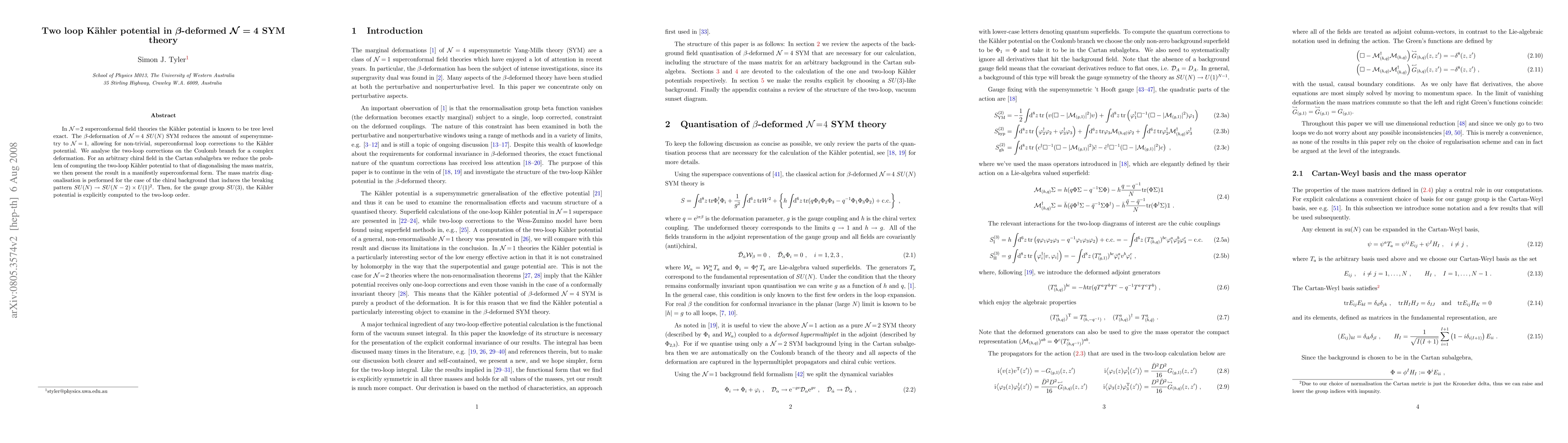 This paper investigates the two-loop corrections to the Kahler potential in beta-deformed N=4 SYM theory, reducing the problem to diagonalizing a mass matrix. For SU(3), it explicitly computes the two-loop Kahler potential in a superconformal form, focusing on the SU(N) to SU(N-2)*U(1)^2 breaking pattern.