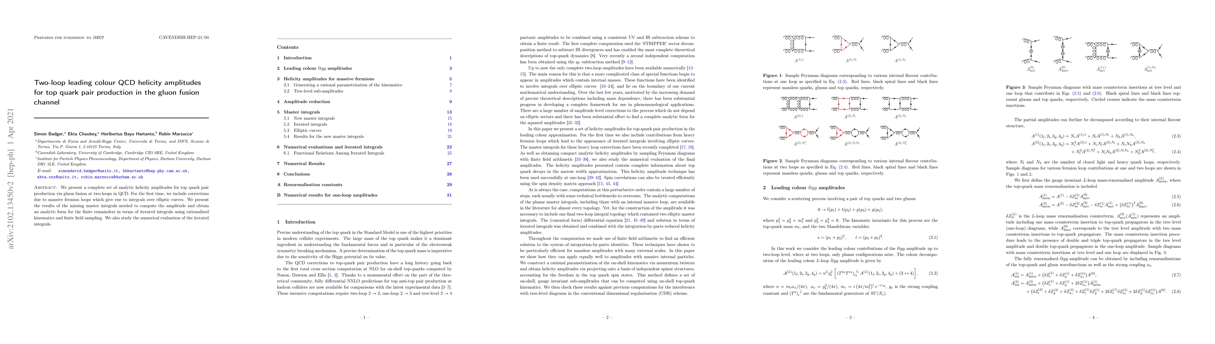 This paper provides a complete set of two-loop leading colour QCD helicity amplitudes for top quark pair production via gluon fusion, including corrections from massive fermion loops and elliptic curve integrals. The study also presents analytic forms for the finite remainders and discusses numerical evaluation methods.