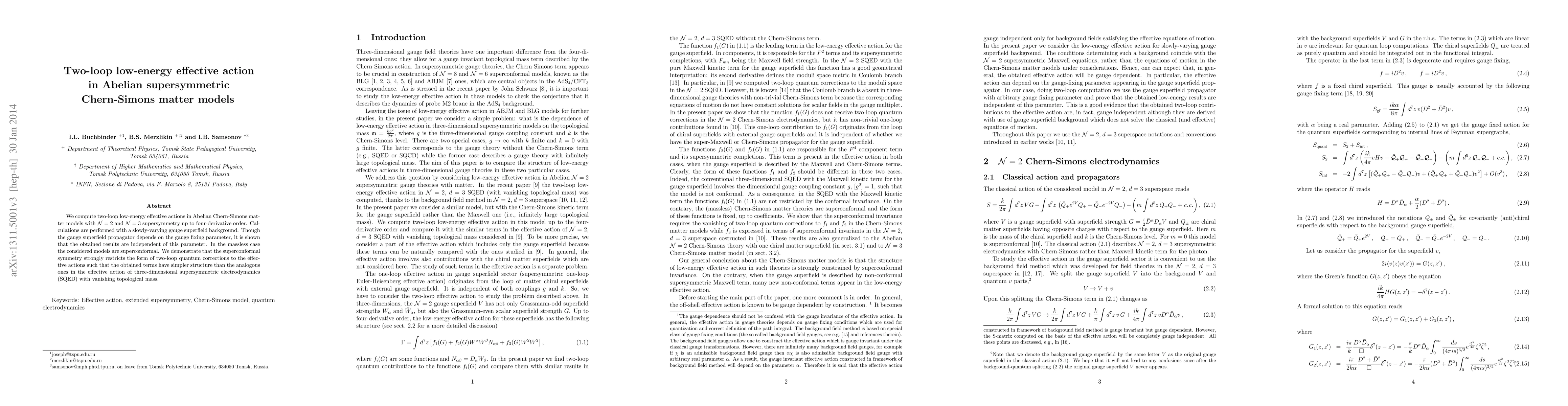 This paper computes two-loop low-energy effective actions in Abelian supersymmetric Chern-Simons matter models with N=2 and N=3 supersymmetry, showing that the results are independent of the gauge fixing parameter. The study reveals that superconformal symmetry constrains the form of two-loop quantum corrections, resulting in a simpler structure compared to analogous terms in three-dimensional supersymmetric electrodynamics.