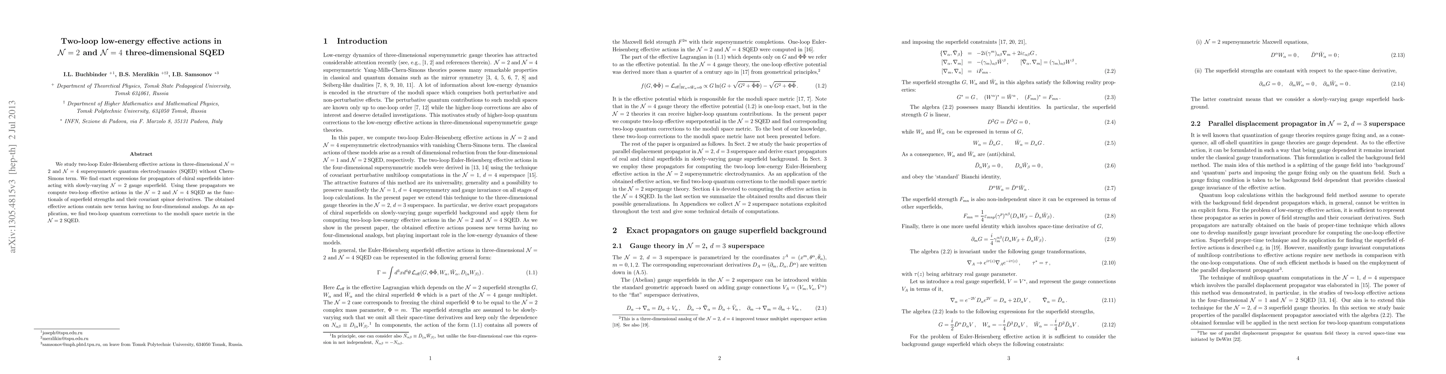 This paper investigates two-loop effective actions in three-dimensional N=2 and N=4 supersymmetric quantum electrodynamics (SQED), deriving exact propagators for chiral superfields and computing new two-loop effective actions with unique terms. It also applies these results to determine two-loop quantum corrections to the moduli space metric in N=2 SQED.