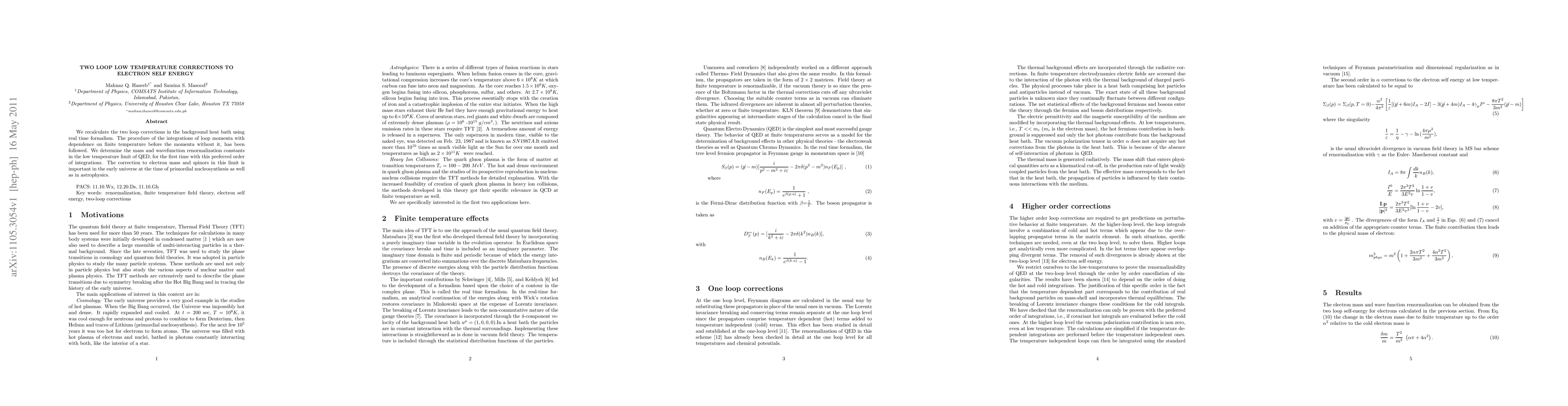 We recalculate the two loop corrections in the background heat bath using real time formalism. The procedure of the integrations of loop momenta with dependence on finite temperature before the momenta without it, has been followed. We determine the mass and wavefunction renormalization constants in the low temperature limit of QED, for the first time with this preferred order of integrations. The correction to electron mass and spinors in this limit is important in the early universe at the time of primordial nucleosynthesis as well as in astrophysics.