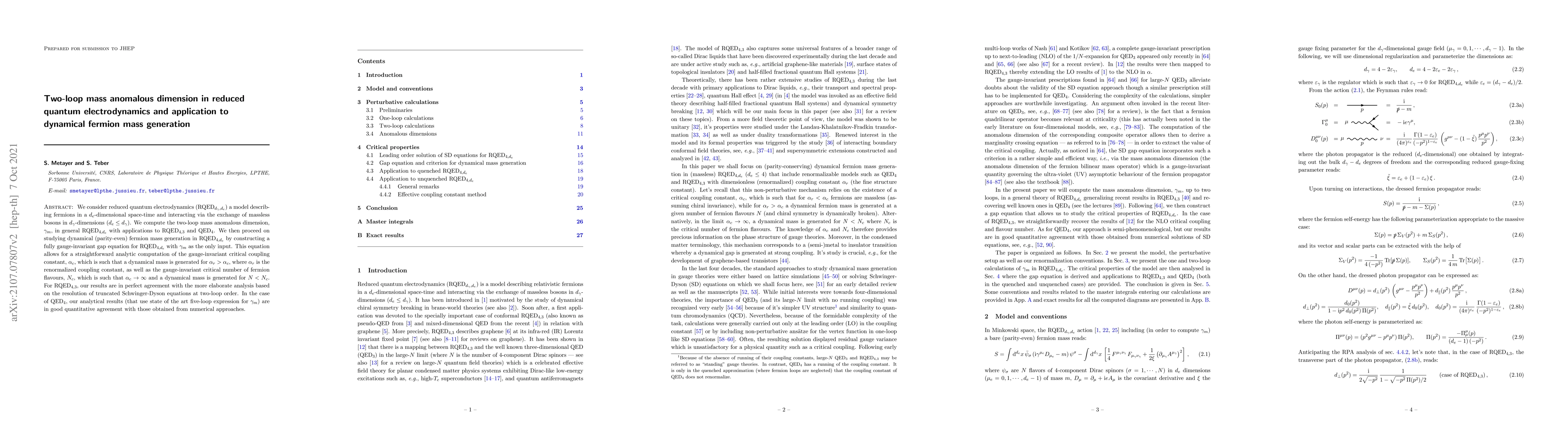 This paper computes the two-loop mass anomalous dimension in reduced quantum electrodynamics (RQED) and applies it to dynamical fermion mass generation. The study provides a gauge-invariant gap equation for RQED, allowing for analytic computation of critical coupling and fermion flavor thresholds for mass generation, with results matching both analytical and numerical methods.