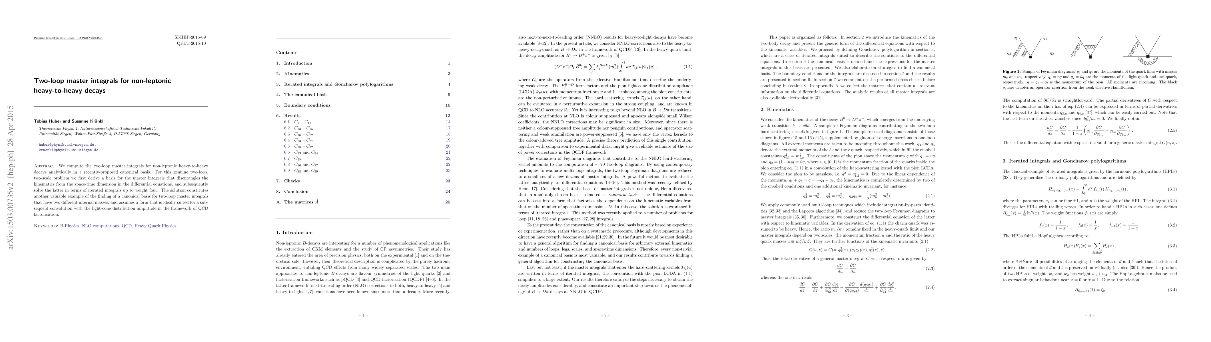 This paper analytically computes two-loop master integrals for non-leptonic heavy-to-heavy decays using a newly proposed canonical basis. The authors derive a basis that separates kinematics from the space-time dimension, solving the differential equations to yield iterated integrals up to weight four, which is well-suited for QCD factorization.