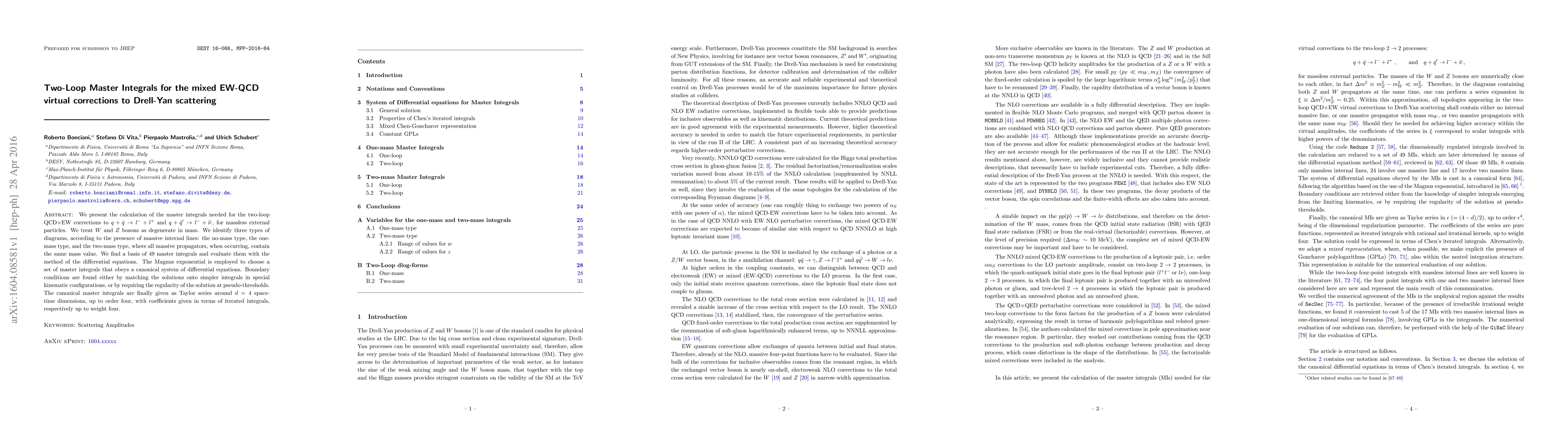 This paper presents the calculation of 49 master integrals essential for two-loop QCDxEW corrections in Drell-Yan scattering, treating W and Z bosons as having equal mass. The methodology involves categorizing diagrams into no-mass, one-mass, and two-mass types, using differential equations, Magnus exponential for a canonical system, and boundary conditions from matching and pseudo-threshold regularity. The master integrals are expressed as Taylor series around d=4 dimensions, up to order four, with coefficients as iterated integrals up to weight four.
