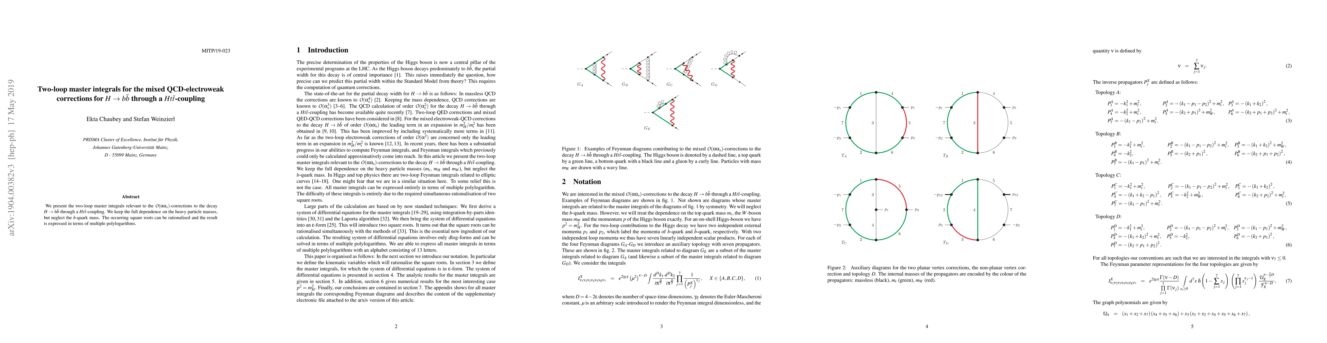We present the two-loop master integrals relevant to the ${\mathcal O}(\alpha \alpha_s)$-corrections to the decay $H \rightarrow b \bar{b}$ through a $H t \bar{t}$-coupling. We keep the full dependence on the heavy particle masses, but neglect the $b$-quark mass. The occurring square roots can be rationalised and the result is expressed in terms of multiple polylogarithms.
