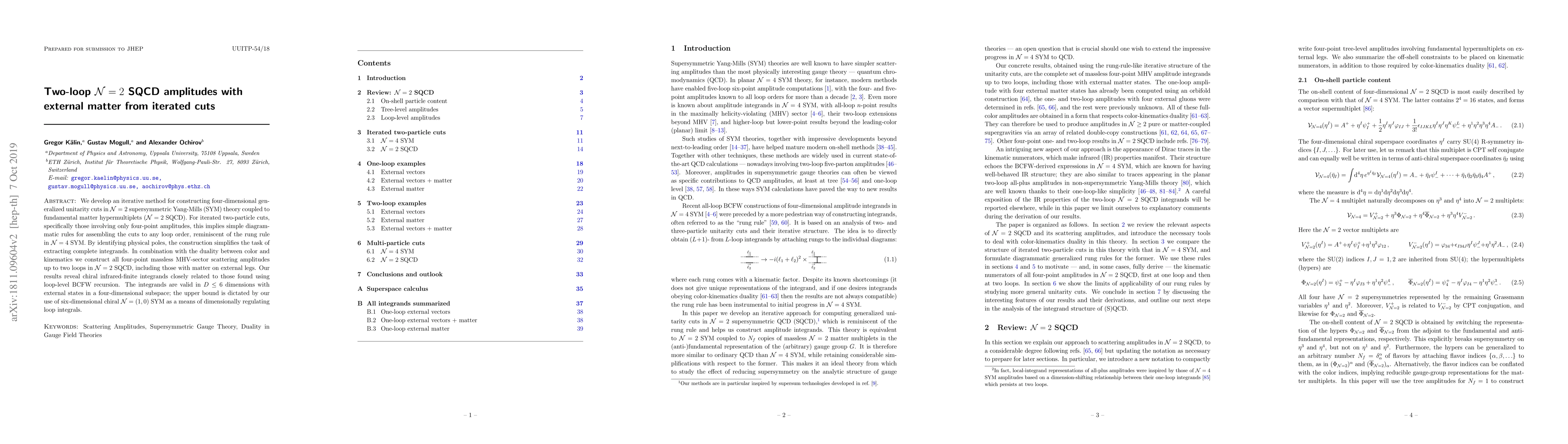 We develop an iterative method for constructing four-dimensional generalized unitarity cuts in $\mathcal{N} = 2$ supersymmetric Yang-Mills (SYM) theory coupled to fundamental matter hypermultiplets ($\mathcal{N} = 2$ SQCD). For iterated two-particle cuts,specifically those involving only four-point amplitudes, this implies simple diagrammatic rules for assembling the cuts to any loop order, reminiscent of the rung rule in $\mathcal{N} = 4$ SYM. By identifying physical poles, the construction simplifies the task of extracting complete integrands. In combination with the duality between color and kinematics we construct all four-point massless MHV-sector scattering amplitudes up to two loops in $\mathcal{N} = 2$ SQCD, including those with matter on external legs. Our results reveal chiral infrared-finite integrands closely related to those found using loop-level BCFW recursion. The integrands are valid in $D\leq 6$ dimensions with external states in a four-dimensional subspace; the upper bound is dictated by our use of six-dimensional chiral $\mathcal{N} = (1,0)$ SYM as a means of dimensionally regulating loop integrals.
