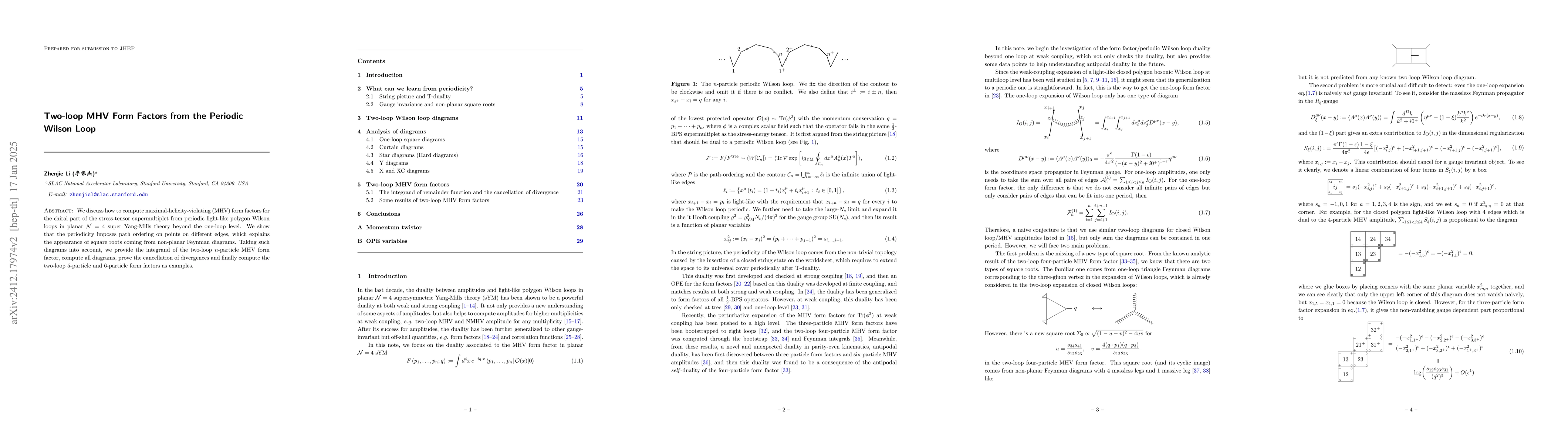We discuss how to compute maximal-helicity-violating (MHV) form factors for the chiral part of the stress-tensor supermultiplet from periodic light-like polygon Wilson loops in the planar $\mathcal N=4$ super Yang-Mills theory beyond the one-loop level. We show that the periodicity imposes path ordering on points on different edges, which explains the appearance of square roots coming from non-planar Feynman diagrams. Taking into account such diagrams, we provide the integrand of the two-loop $n$-particle MHV form factor, compute all diagrams, prove the cancellation of divergence and finally compute the two-loop 5-particle and 6-particle form factors as examples.