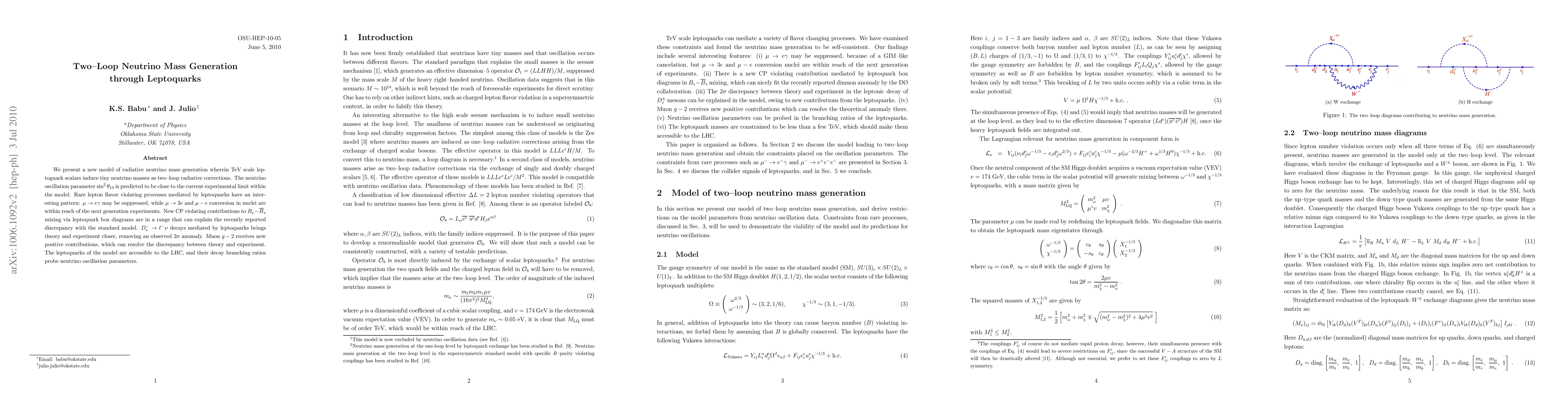 This paper proposes a new model for neutrino mass generation via two-loop radiative corrections induced by TeV scale leptoquarks, predicting \sin^2\theta_{13} near current experimental limits. The model also addresses rare lepton flavor violating processes and CP-violating contributions, potentially resolving discrepancies with the standard model.
