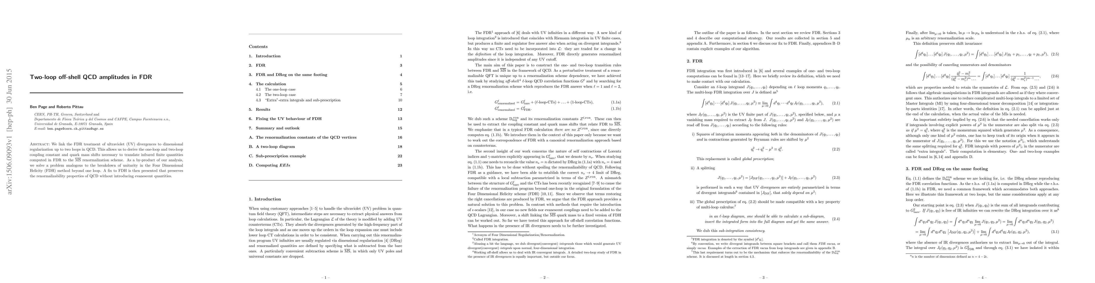 We link the FDR treatment of ultraviolet (UV) divergences to dimensional regularization up to two loops in QCD. This allows us to derive the one-loop and two-loop coupling constant and quark mass shifts necessary to translate infrared finite quantities computed in FDR to the MSbar renormalization scheme. As a by-product of our analysis, we solve a problem analogous to the breakdown of unitarity in the Four Dimensional Helicity (FDH) method beyond one loop. A fix to FDH is then presented that preserves the renormalizability properties of QCD without introducing evanescent quantities.
