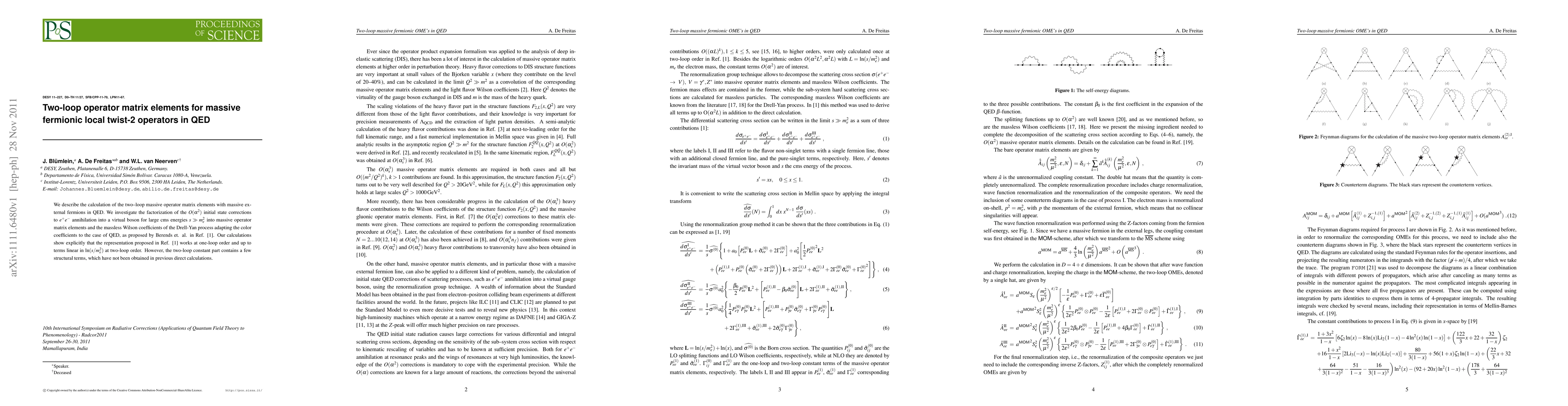 We describe the calculation of the two--loop massive operator matrix elements with massive external fermions in QED. We investigate the factorization of the $O(\alpha^2)$ initial state corrections to $e^+e^-$ annihilation into a virtual boson for large cms energies $s \gg m_e^2$ into massive operator matrix elements and the massless Wilson coefficients of the Drell-Yan process adapting the color coefficients to the case of QED, as proposed by Berends et. al. in Ref. [1]. Our calculations show explicitly that the representation proposed in Ref. [1] works at one-loop order and up to terms linear in $\ln(s/m^2_e)$ at two-loop order. However, the two-loop constant part contains a few structural terms, which have not been obtained in previous direct calculations.