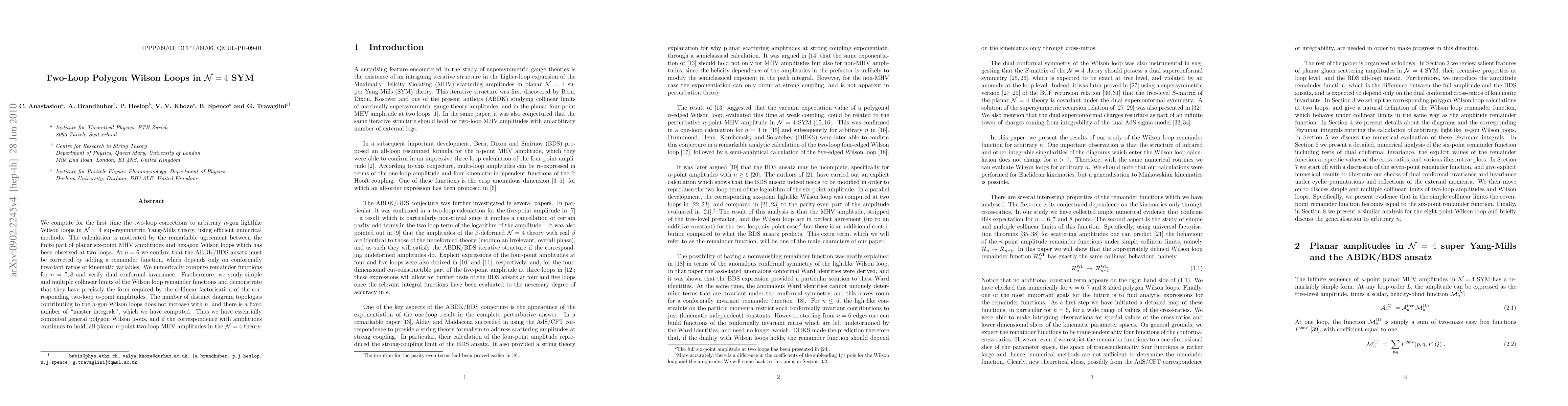 This research computes the two-loop corrections to n-gon lightlike Wilson loops in N=4 supersymmetric Yang-Mills theory, confirming the ABDK/BDS ansatz requires corrections by introducing conformally invariant remainder functions. The study also verifies dual conformal invariance and demonstrates the collinear factorization form of the Wilson loop remainder functions.
