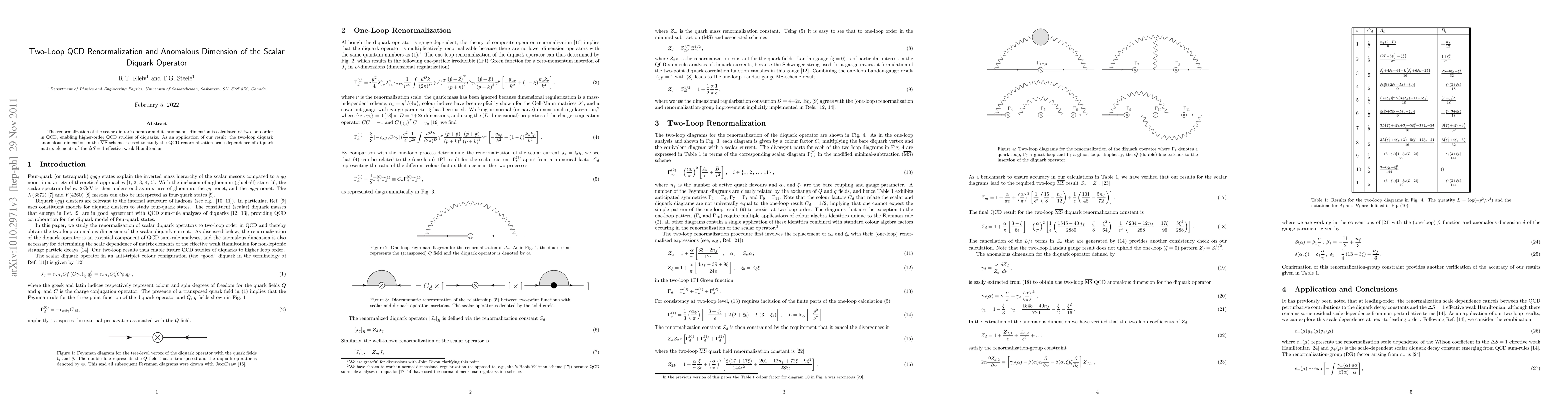 This paper calculates the two-loop QCD renormalization and anomalous dimension of the scalar diquark operator, providing higher-order QCD studies tools. It also applies the two-loop diquark anomalous dimension to analyze the QCD renormalization scale dependence of diquark matrix elements in the $\Delta S=1$ effective weak Hamiltonian.