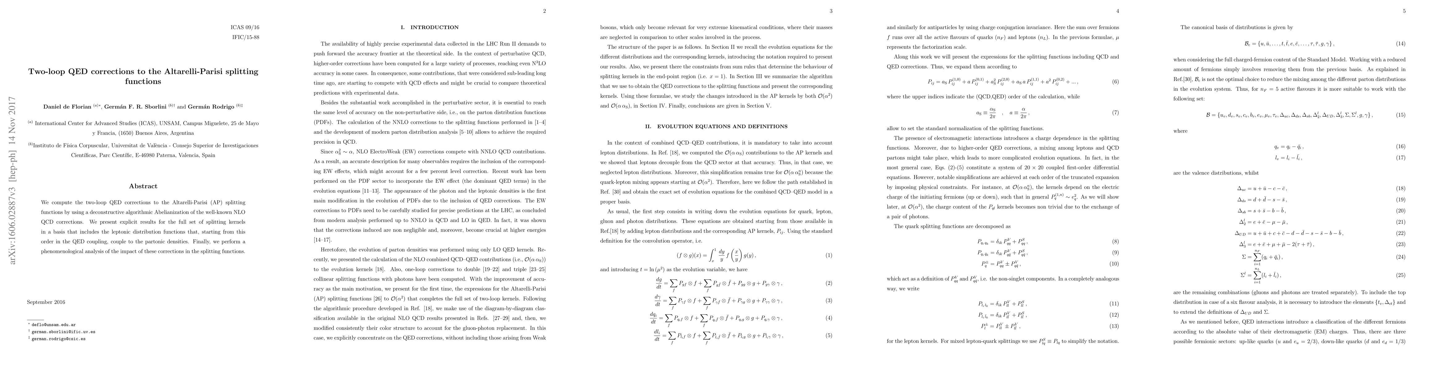 This paper computes the two-loop QED corrections to the Altarelli-Parisi splitting functions using an algorithmic approach to Abelianize the NLO QCD corrections, presenting explicit results for the full set of splitting kernels. It also analyzes the phenomenological impact of these corrections on partonic densities.