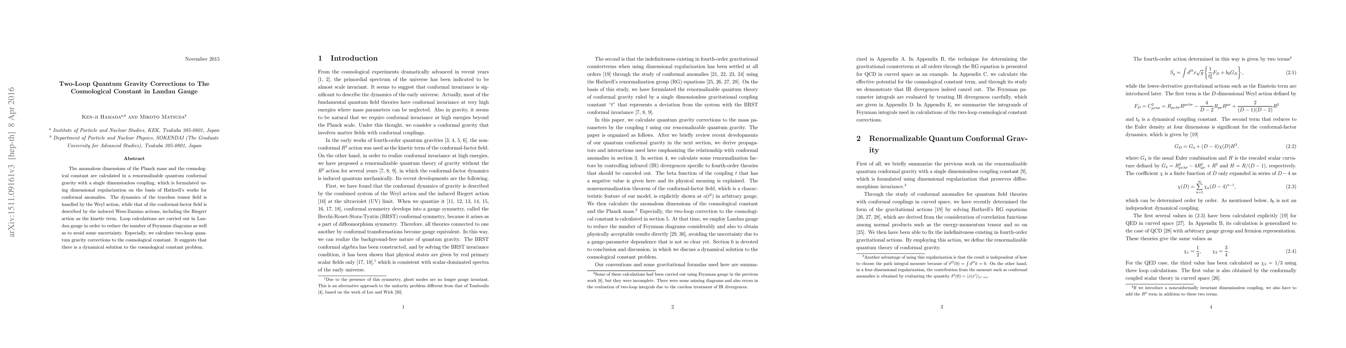 This paper calculates two-loop quantum gravity corrections to the cosmological constant using a renormalizable quantum conformal gravity framework formulated in Landau gauge. It suggests a dynamical resolution to the cosmological constant problem by addressing anomalous dimensions of the Planck mass and the cosmological constant.