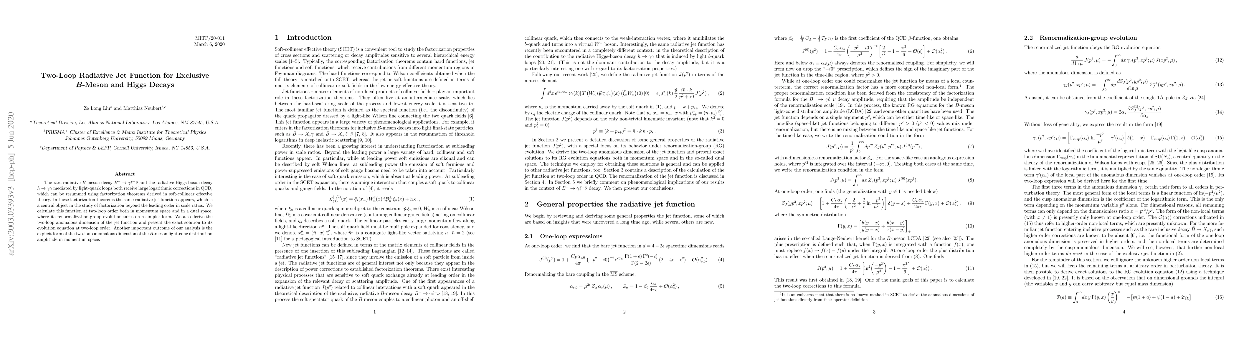 The rare radiative $B$-meson decay $B^-\to\gamma\ell^-\bar\nu$ and the radiative Higgs-boson decay $h\to\gamma\gamma$ mediated by light-quark loops both receive large logarithmic corrections in QCD, which can be resummed using factorization theorems derived in soft-collinear effective theory. In these factorization theorems the same radiative jet function appears, which is a central object in the study of factorization beyond the leading order in scale ratios. We calculate this function at two-loop order both in momentum space and in a dual space, where its renormalization-group evolution takes on a simpler form. We also derive the two-loop anomalous dimension of the jet function and present the exact solution to its evolution equation at two-loop order. Another important outcome of our analysis is the explicit form of the two-loop anomalous dimension of the $B$-meson light-cone distribution amplitude in momentum space.