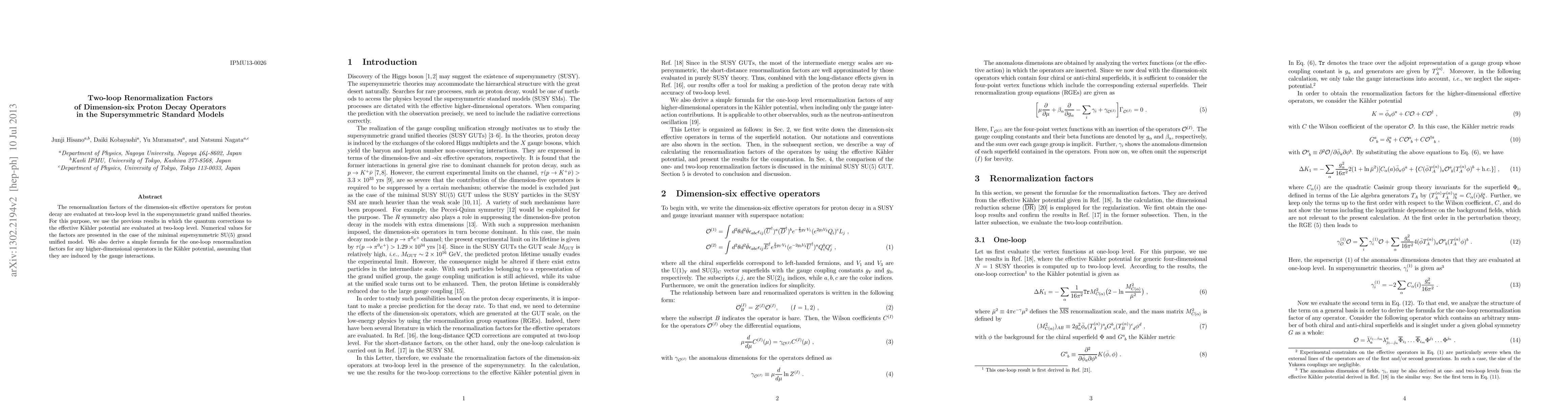 This paper evaluates the two-loop renormalization factors for dimension-six proton decay operators in supersymmetric grand unified theories, specifically focusing on the minimal supersymmetric SU(5) model. It also provides a formula for one-loop renormalization factors of higher-dimensional operators in the Kähler potential.