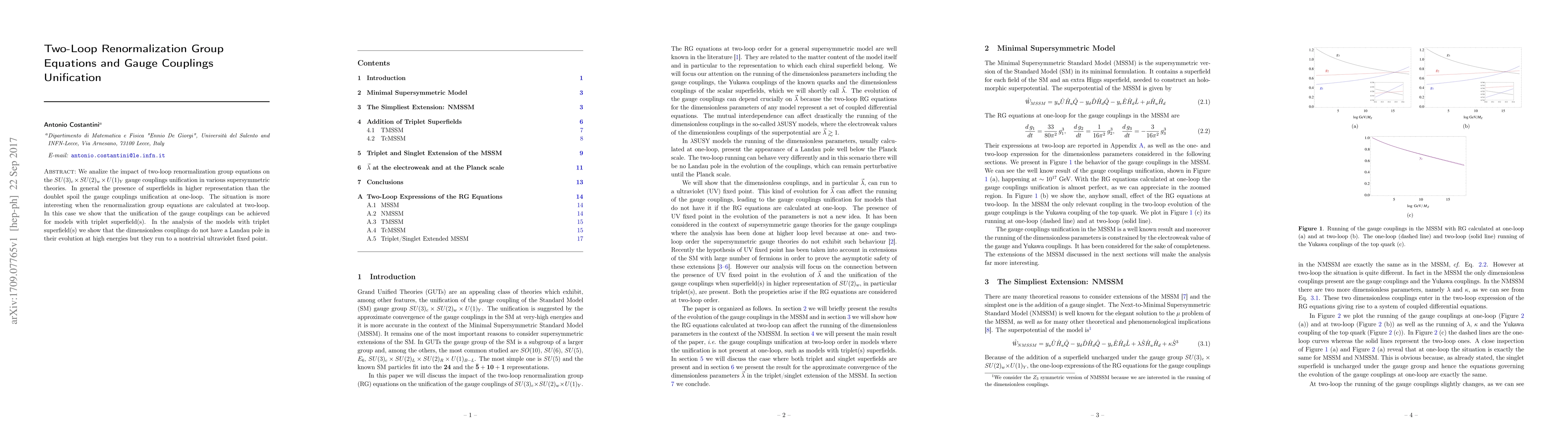 This paper investigates the effect of two-loop renormalization group equations on the unification of $SU(3)_c\times SU(2)_w\times U(1)_Y$ gauge couplings in supersymmetric theories, demonstrating that triplet superfields can achieve unification without Landau poles, leading to a nontrivial ultraviolet fixed point.