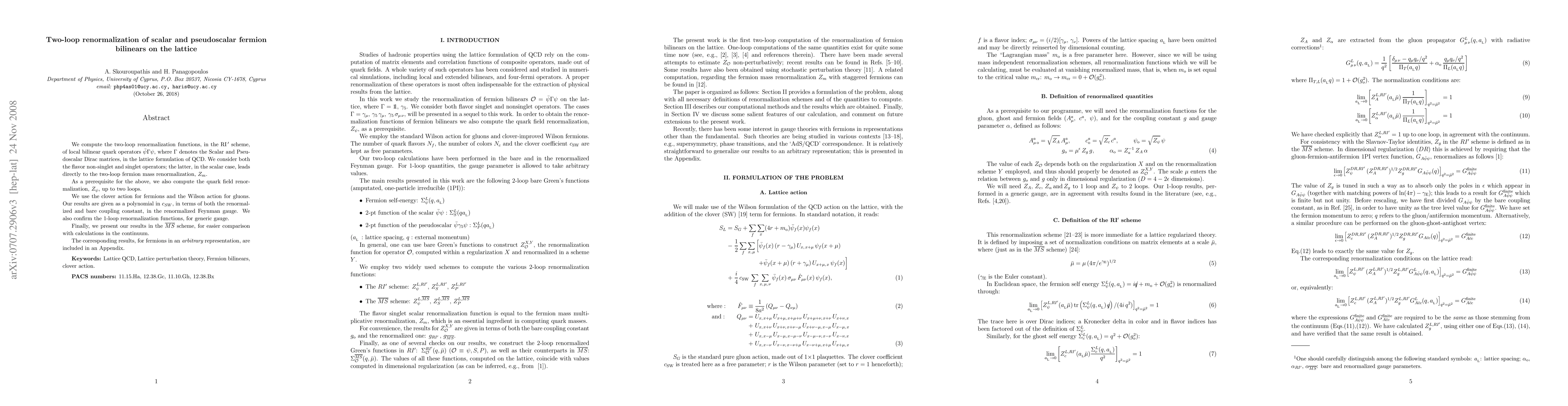 We compute the two-loop renormalization functions, in the RI $^\prime$ scheme, of local bilinear quark operators $\bar{\psi}\Gamma\psi$, where $\Gamma$ denotes the Scalar and Pseudoscalar Dirac matrices, in the lattice formulation of QCD. We consider both the flavor non-singlet and singlet operators; the latter, in the scalar case, leads directly to the two-loop fermion mass renormalization, $Z_m$. As a prerequisite for the above, we also compute the quark field renormalization, $Z_{\psi}$, up to two loops. We use the clover action for fermions and the Wilson action for gluons. Our results are given as a polynomial in $c_{SW}$, in terms of both the renormalized and bare coupling constant, in the renormalized Feynman gauge. We also confirm the 1-loop renormalization functions, for generic gauge. Finally, we present our results in the $\bar{MS}$ scheme, for easier comparison with calculations in the continuum. The corresponding results, for fermions in an arbitrary representation, are included in an Appendix.