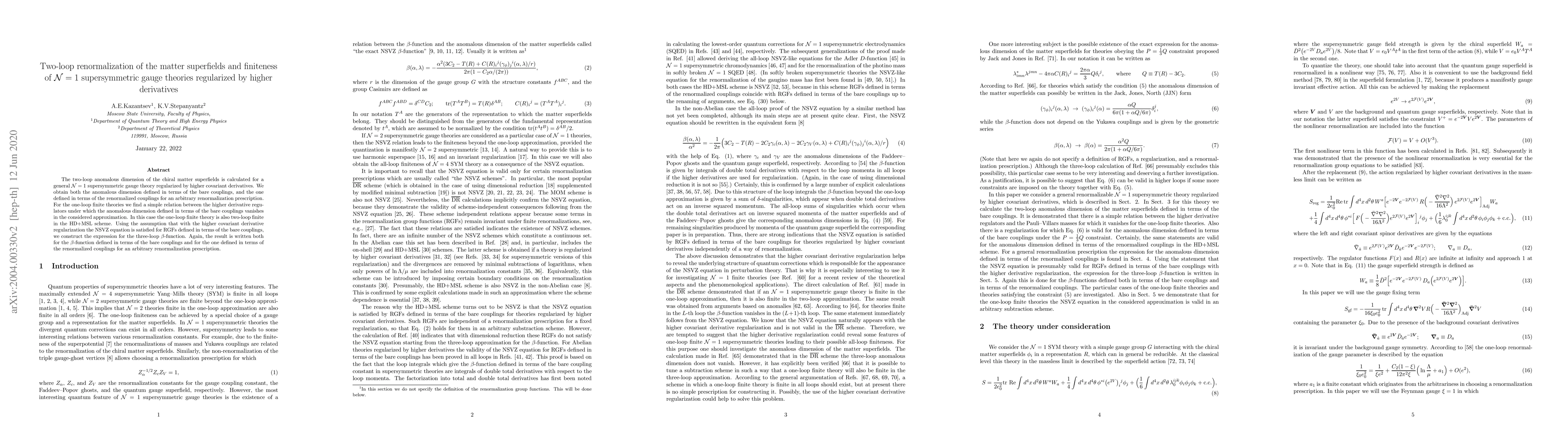 This paper calculates the two-loop anomalous dimension for chiral matter superfields in ${\cal N}=1$ supersymmetric gauge theories regularized by higher covariant derivatives, establishing a two-loop finiteness condition for one-loop finite theories. It also constructs the three-loop $\beta$-function for both bare and renormalized couplings.