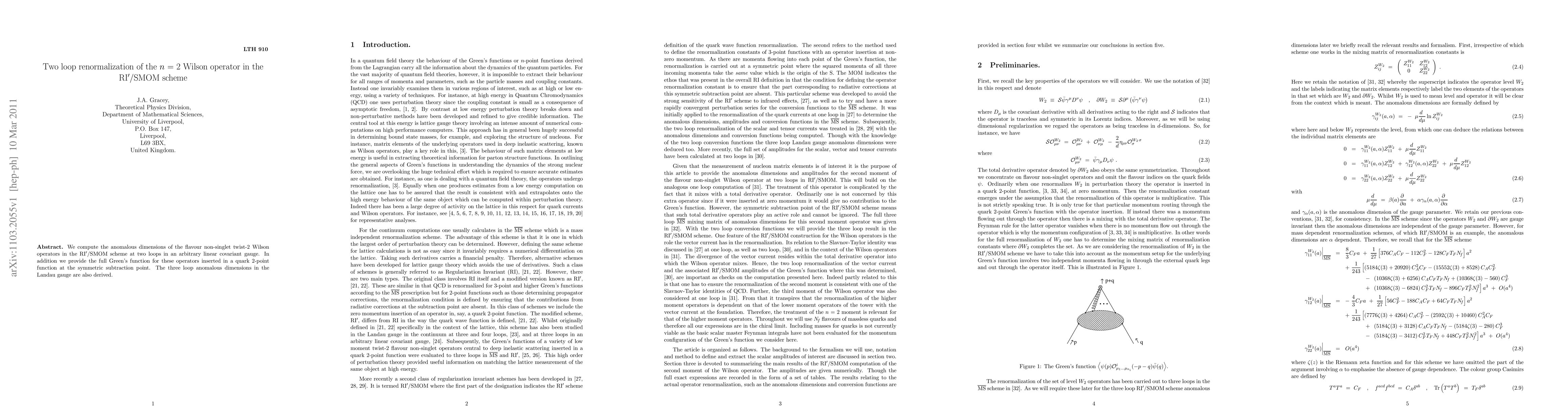 This paper computes the two-loop anomalous dimensions of flavour non-singlet twist-2 Wilson operators in the RI'/SMOM scheme and provides the full Green's function for quark 2-point functions. Additionally, it derives the three-loop anomalous dimensions in the Landau gauge.