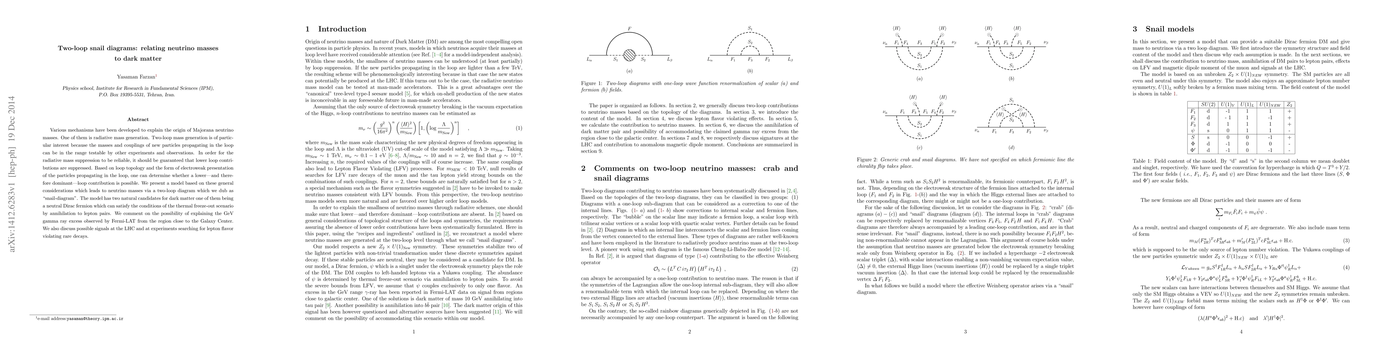 Various mechanisms have been developed to explain the origin of Majorana neutrino masses. One of them is radiative mass generation. Two-loop mass generation is of particular interest because the masses and couplings of new particles propagating in the loop can be in the range testable by other experiments and observations. In order for the radiative mass suppression to be reliable, it should be guaranteed that lower loop contributions are suppressed. Based on loop topology and the form of electroweak presentation of the particles propagating in the loop, one can determine whether a lower---and therefore dominant---loop contribution is possible. We present a model based on these general considerations which leads to neutrino masses via a two-loop diagram which we dub as "snail-diagram". The model has two natural candidates for dark matter one of them being a neutral Dirac fermion which can satisfy the conditions of the thermal freeze-out scenario by annihilation to lepton pairs. We comment on the possibility of explaining the GeV gamma ray excess observed by Fermi-LAT from the region close to the Galaxy Center. We also discuss possible signals at the LHC and at experiments searching for lepton flavor violating rare decays.