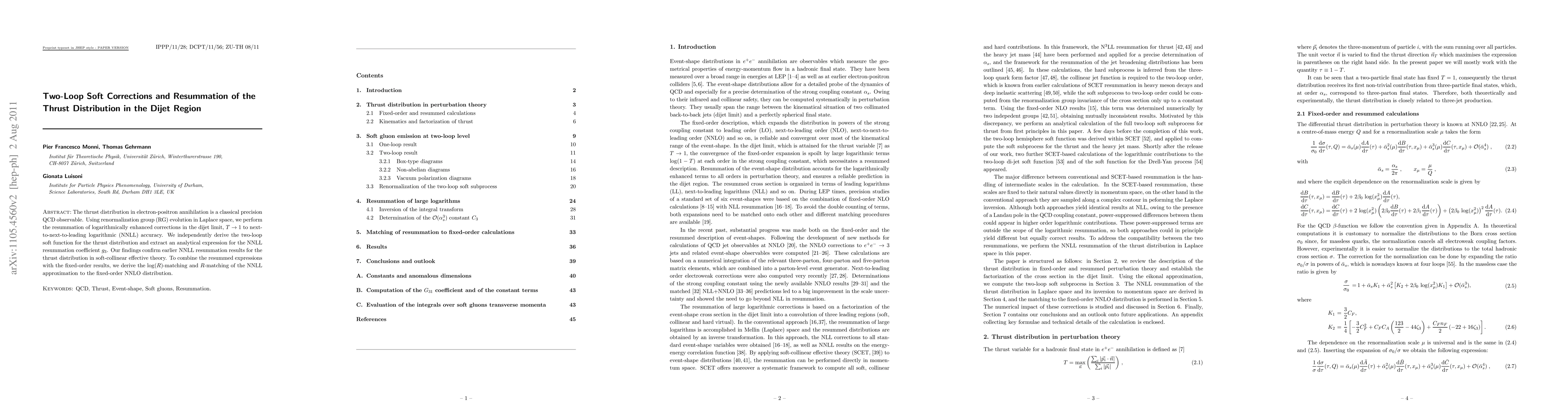This paper presents a detailed analysis of the two-loop soft corrections and resummation for the thrust distribution in the dijet region of electron-positron annihilation, achieving next-to-next-to-leading logarithmic (NNLL) accuracy. It derives the two-loop soft function and the NNLL resummation coefficient $g_3$, and provides matching conditions for combining resummed and fixed-order results.