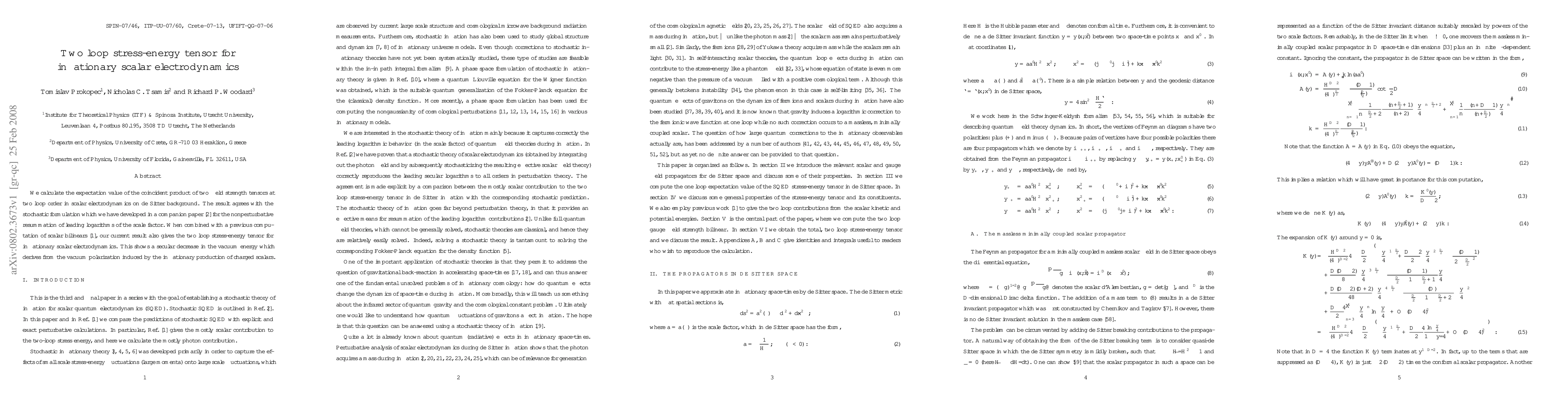 This paper calculates the two-loop stress-energy tensor for inflationary scalar electrodynamics on a de Sitter background, confirming agreement with a stochastic formulation for nonperturbative resummation. Combined with prior work, it reveals a secular decrease in vacuum energy due to vacuum polarization from inflationary charged scalar production.