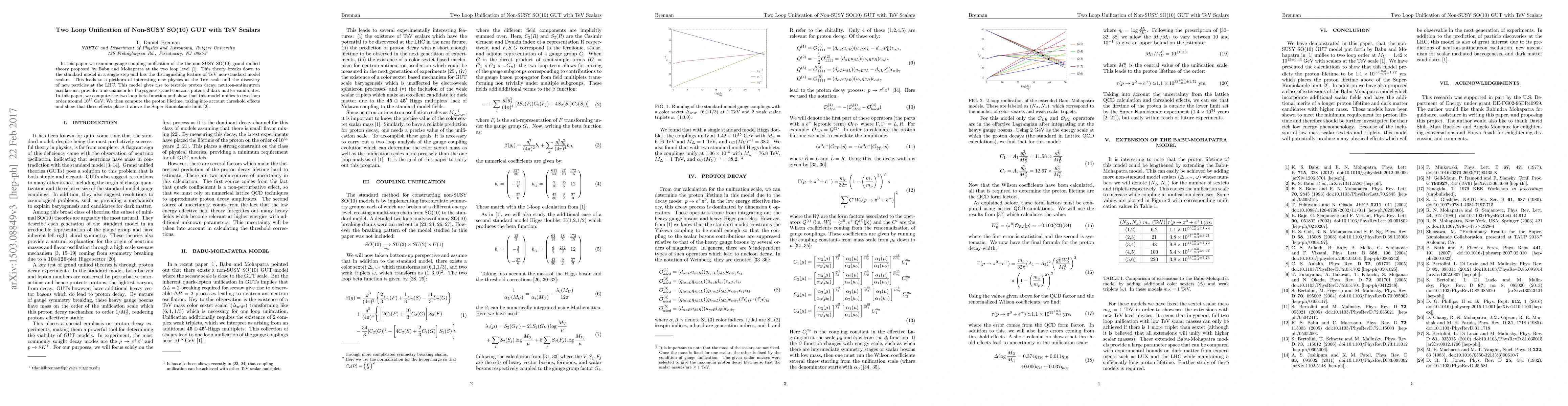 In this paper we examine gauge coupling unification of the the non-SUSY SO(10) grand unified theory proposed by Babu and Mohapatra at the two loop level. This theory breaks down to the standard model in a single step and has the distinguishing feature of TeV non-standard model scalars. This leads to a plethora of interesting new physics at the TeV scale and the discovery of new particles at the LHC. This model gives rise to testable proton decay, neutron-antineutron oscillations, provides a mechanism for baryogenesis, and contains potential dark matter candidates. In this paper, we compute the two loop beta function and show that this model unifies to two loop order around $10^{15}$ GeV. We then compute the proton lifetime, taking into account threshold effects and show that these effects place it above the Super Kamiokande limit.