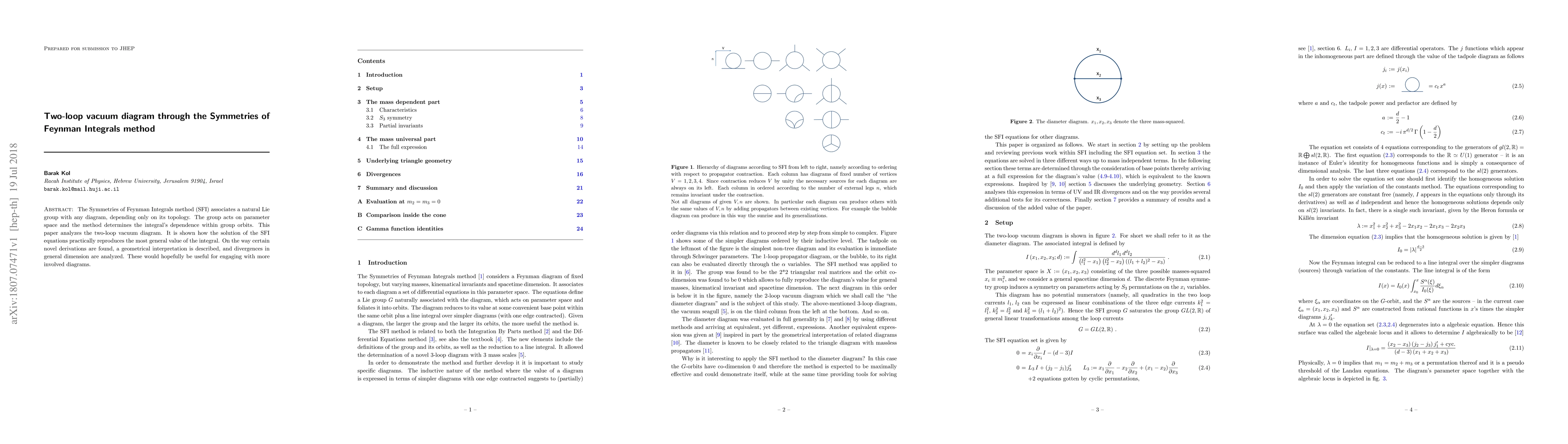 This paper employs the Symmetries of Feynman Integrals (SFI) method to analyze a two-loop vacuum diagram, demonstrating how SFI equations yield the most general integral value. It also introduces novel derivations, provides a geometrical interpretation, and examines divergences in various dimensions.