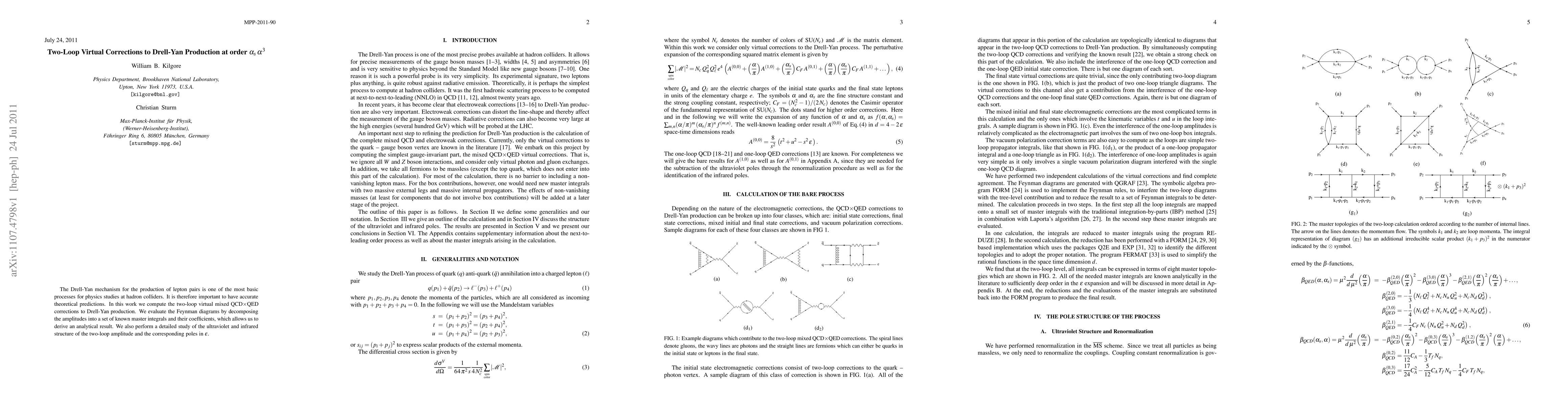 The Drell-Yan mechanism for the production of lepton pairs is one of the most basic processes for physics studies at hadron colliders. It is therefore important to have accurate theoretical predictions. In this work we compute the two-loop virtual mixed QCD x QED corrections to Drell-Yan production. We evaluate the Feynman diagrams by decomposing the amplitudes into a set of known master integrals and their coefficients, which allows us to derive an analytical result. We also perform a detailed study of the ultraviolet and infrared structure of the two-loop amplitude and the corresponding poles in epsilon.