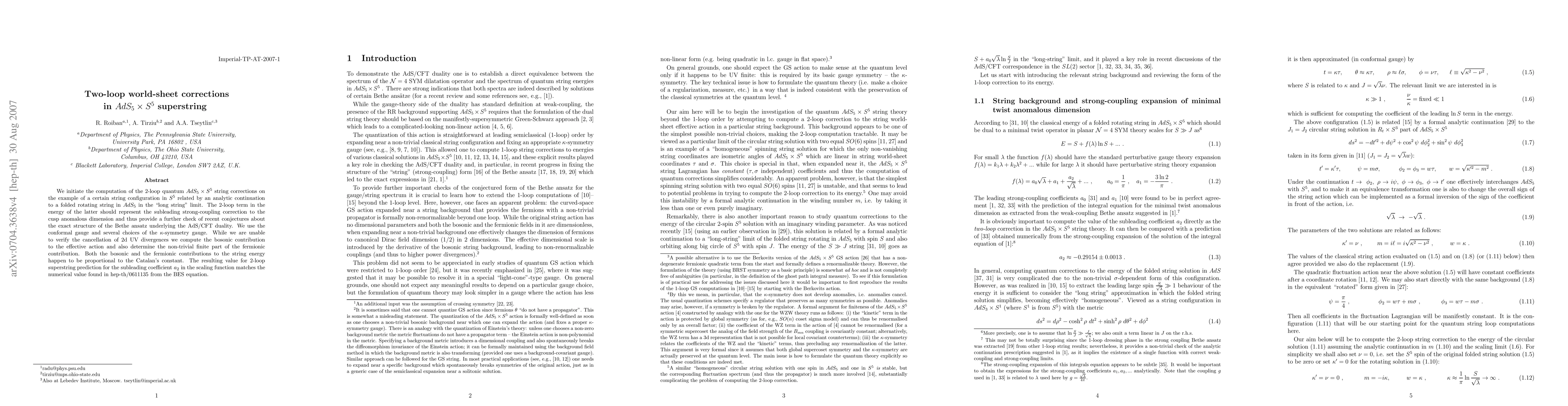 Researchers computed 2-loop corrections to the energy of a superstring in AdS_5 x S^5, finding that the bosonic and fermionic contributions both scale with Catalan's constant, confirming recent conjectures about the Bethe ansatz.