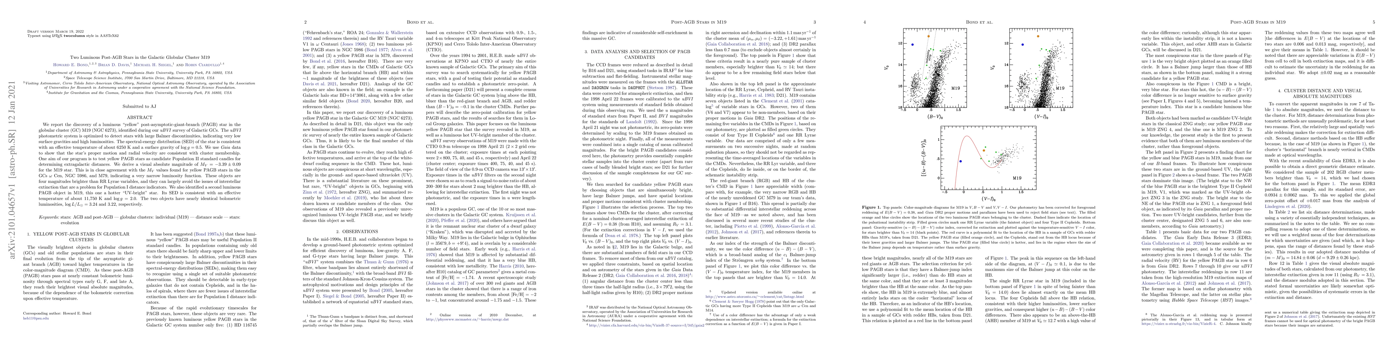 We report the discovery of a luminous "yellow" post-asymptotic-giant-branch (PAGB) star in the globular cluster (GC) M19 (NGC 6273), identified during our uBVI survey of Galactic GCs. The uBVI photometric system is optimized to detect stars with large Balmer discontinuities, indicating very low surface gravities and high luminosities. The spectral-energy distribution (SED) of the star is consistent with an effective temperature of about 6250 K and a surface gravity of $\log g=0.5$. We use Gaia data to show that the star's proper motion and radial velocity are consistent with cluster membership. One aim of our program is to test yellow PAGB stars as candidate Population II standard candles for determining extragalactic distances. We derive a visual absolute magnitude of $M_V=-3.39\pm0.09$ for the M19 star. This is in close agreement with the $M_V$ values found for yellow PAGB stars in the GCs omega Cen, NGC 5986, and M79, indicating a very narrow luminosity function. These objects are four magnitudes brighter than RR Lyrae variables, and they can largely avoid the issues of interstellar extinction that are a problem for Population I distance indicators. We also identified a second luminous PAGB object in M19, this one a hotter "UV-bright" star. Its SED is consistent with an effective temperature of about 11,750 K and $\log g=2.0$. The two objects have nearly identical bolometric luminosities, $\log L/L_\odot=3.24$ and 3.22, respectively.