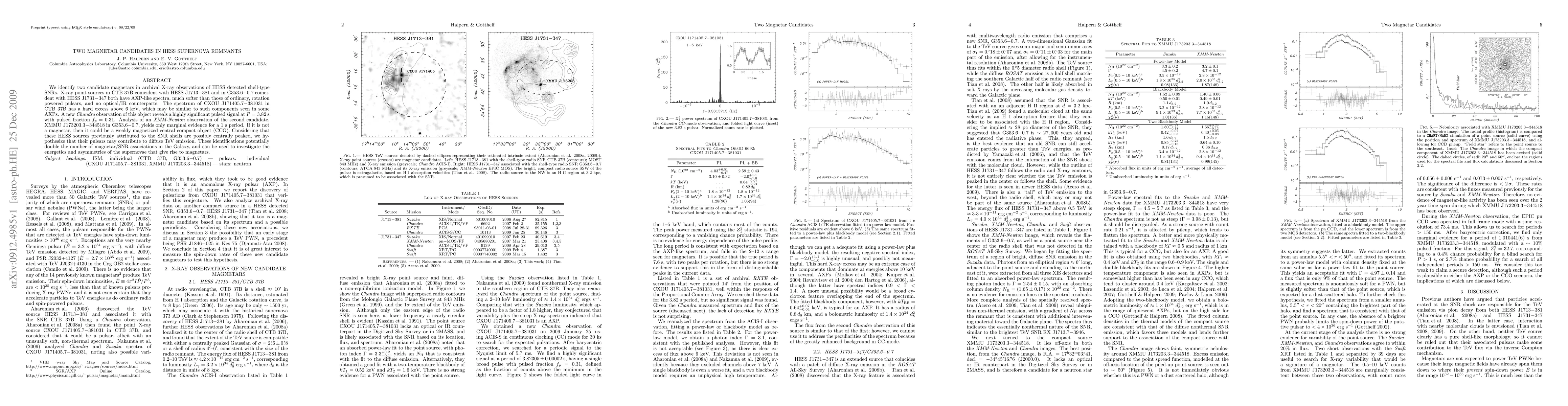 We identify two candidate magnetars in archival X-ray observations of HESS detected shell-type SNRs. X-ray point sources in CTB 37B coincident with HESS J1713-381 and in G353.6-0.7 coincident with HESS J1731-347 both have AXP-like spectra, much softer than those of ordinary, rotation powered pulsars, and no optical/IR counterparts. The spectrum of CXOU J171405.7-381031 in CTB 37B has a hard excess above 6 keV, which may be similar to such components seen in some AXPs. A new Chandra observation of this object reveals a highly significant pulsed signal at P = 3.82 s with pulsed fraction f_p = 0.31. Analysis of an XMM-Newton observation of the second candidate, XMMU J173203.3-344518 in G353.6-0.7, yields only marginal evidence for a 1 s period. If it is not a magnetar, then it could be a weakly magnetized central compact object (CCO). Considering that these HESS sources previously attributed to the SNR shells are possibly centrally peaked, we hypothesize that their pulsars may contribute to diffuse TeV emission. These identifications potentially double the number of magnetar/SNR associations in the Galaxy, and can be used to investigate the energetics and asymmetries of the supernovae that give rise to magnetars.