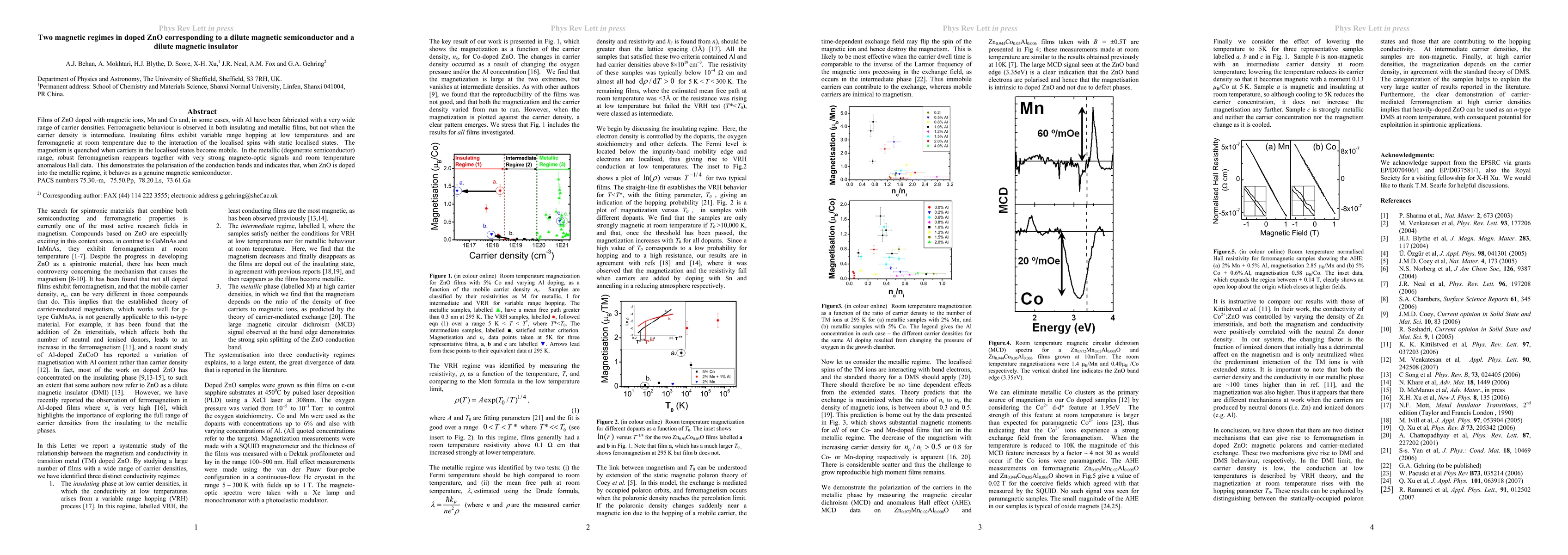 Films of ZnO doped with magnetic ions, Mn and Co and, in some cases, with Al have been fabricated with a very wide range of carrier densities. Ferromagnetic behaviour is observed in both insulating and metallic films, but not when the carrier density is intermediate. Insulating films exhibit variable range hopping at low temperatures and are ferromagnetic at room temperature due to the interaction of the localised spins with static localised states. The magnetism is quenched when carriers in the localised states become mobile. In the metallic (degenerate semiconductor) range, robust ferromagnetism reappears together with very strong magneto-optic signals and room temperature anomalous Hall data. This demonstrates the polarisation of the conduction bands and indicates that, when ZnO is doped into the metallic regime, it behaves as a genuine magnetic semiconductor.