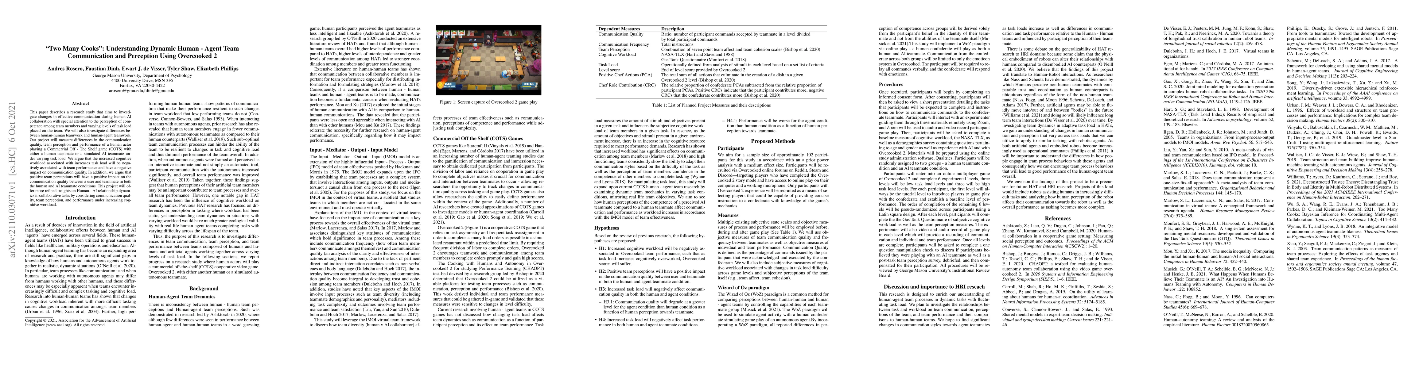 This paper describes a research study that aims to investigate changes in effective communication during human-AI collaboration with special attention to the perception of competence among team members and varying levels of task load placed on the team. We will also investigate differences between human-human teamwork and human-agent teamwork. Our project will measure differences in the communication quality, team perception and performance of a human actor playing a Commercial Off - The Shelf game (COTS) with either a human teammate or a simulated AI teammate under varying task load. We argue that the increased cognitive workload associated with increases task load will be negatively associated with team performance and have a negative impact on communication quality. In addition, we argue that positive team perceptions will have a positive impact on the communication quality between a user and teammate in both the human and AI teammate conditions. This project will offer more refined insights on Human - AI relationship dynamics in collaborative tasks by considering communication quality, team perception, and performance under increasing cognitive workload.
